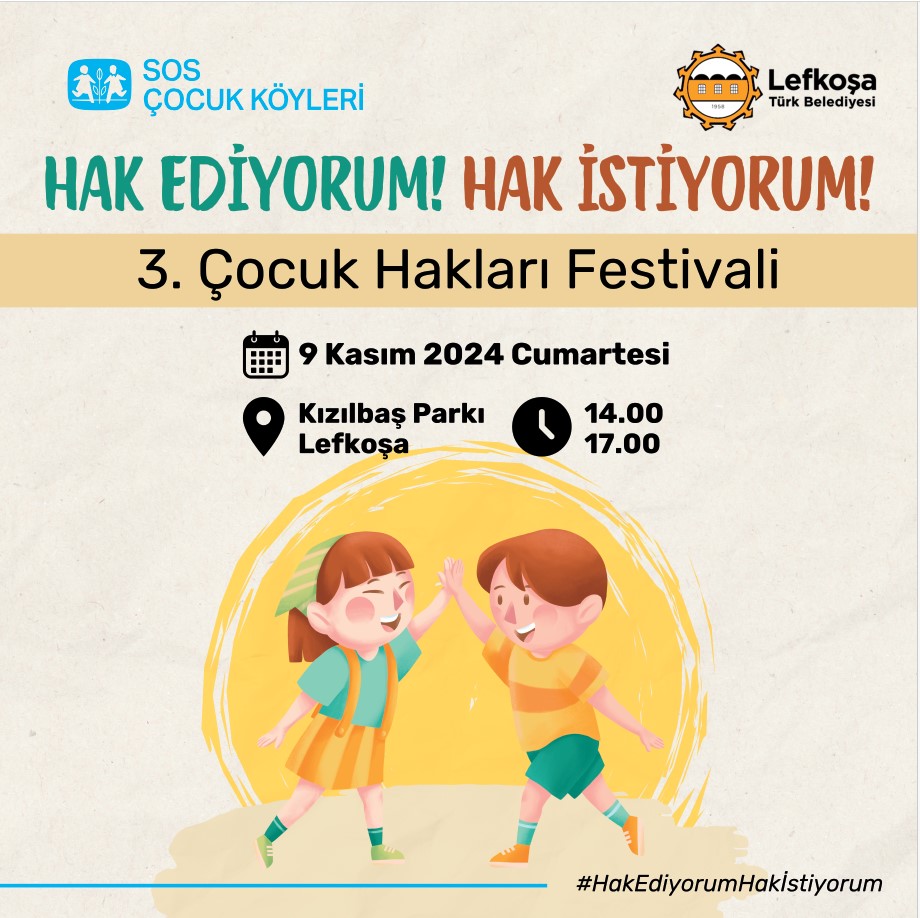 Lefkoşa, 30 Ekim 24 (TAK): 3. Çocuk Hakları Festivali 9 Kasım Cumartesi Lefkoşa Kızılbaş Parkı’nda yapılacak.