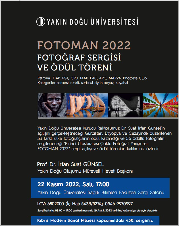 Lefkoşa, 21 Kasım 22 (TAK): Yakın Doğu Üniversitesi’nde yarın 33 farklı ülke fotoğrafçısının ödüllü 56 fotoğrafının sergileneceği “Fotoman 2022 Fotoğraf Sergisi” açılıyor.