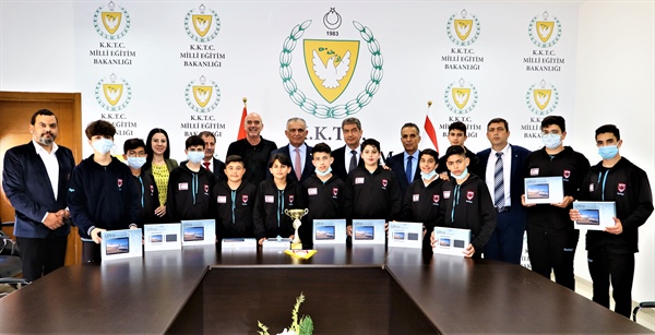 Lefkoşa, 13 Nisan 22 (T.A.K): Milli Eğitim Bakanı Nazım Çavuşoğlu Türkiye'nin Aksaray bölgesinde düzenlenen ortaokullar arası Yıldızlar Voleybol Finalleri’nde Türkiye ikincisi gelen Gazimağusa Türk Maarif Koleji Erkek Voleybol Takımı öğrencilerini, öğretmenlerini ve okul müdürünü kabul etti.