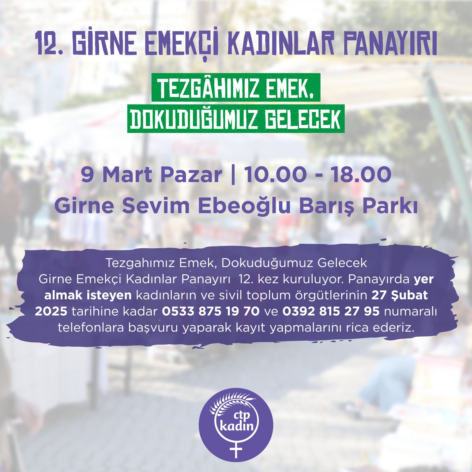 Lefkoşa, 7 Şubat 25 (TAK): "Tezgâhımız Emek, Dokuduğumuz Gelecek" sloganıyla gelenekselleşen 12. Emekçi Kadınlar Panayırı, 9 Mart Pazar günü kurulacak.