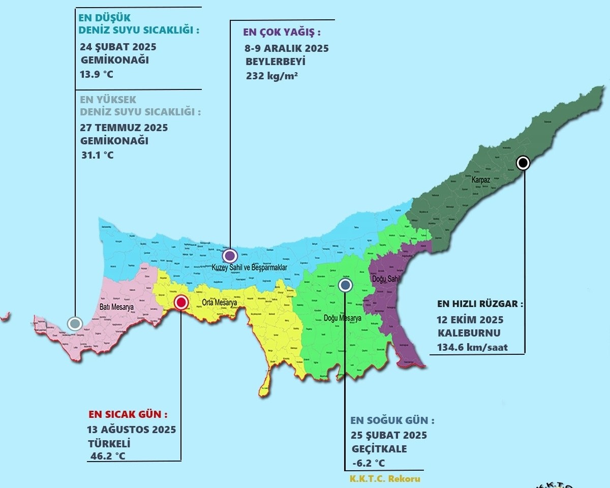 Lefkoşa, 9 Ocak 26 (TAK): Meteoroloji Daresi, 2025 yılına ilişkin yağış miktarlarıyla hava ve deniz suyu sıcaklılarında en yüksek ve en düşük değerleri açıkladı.