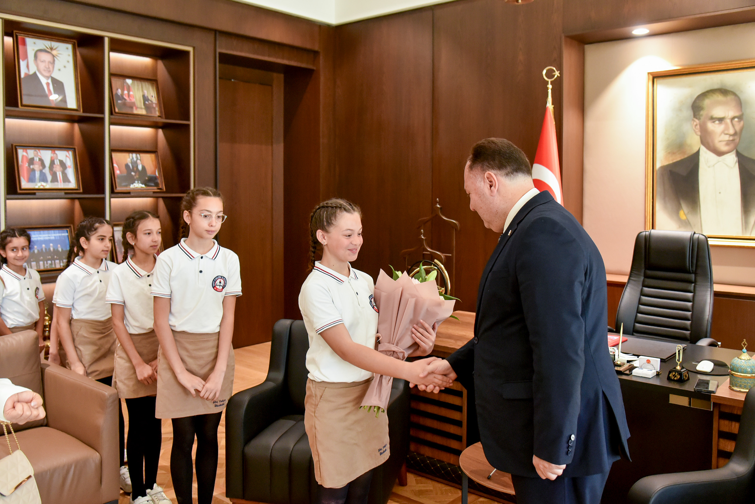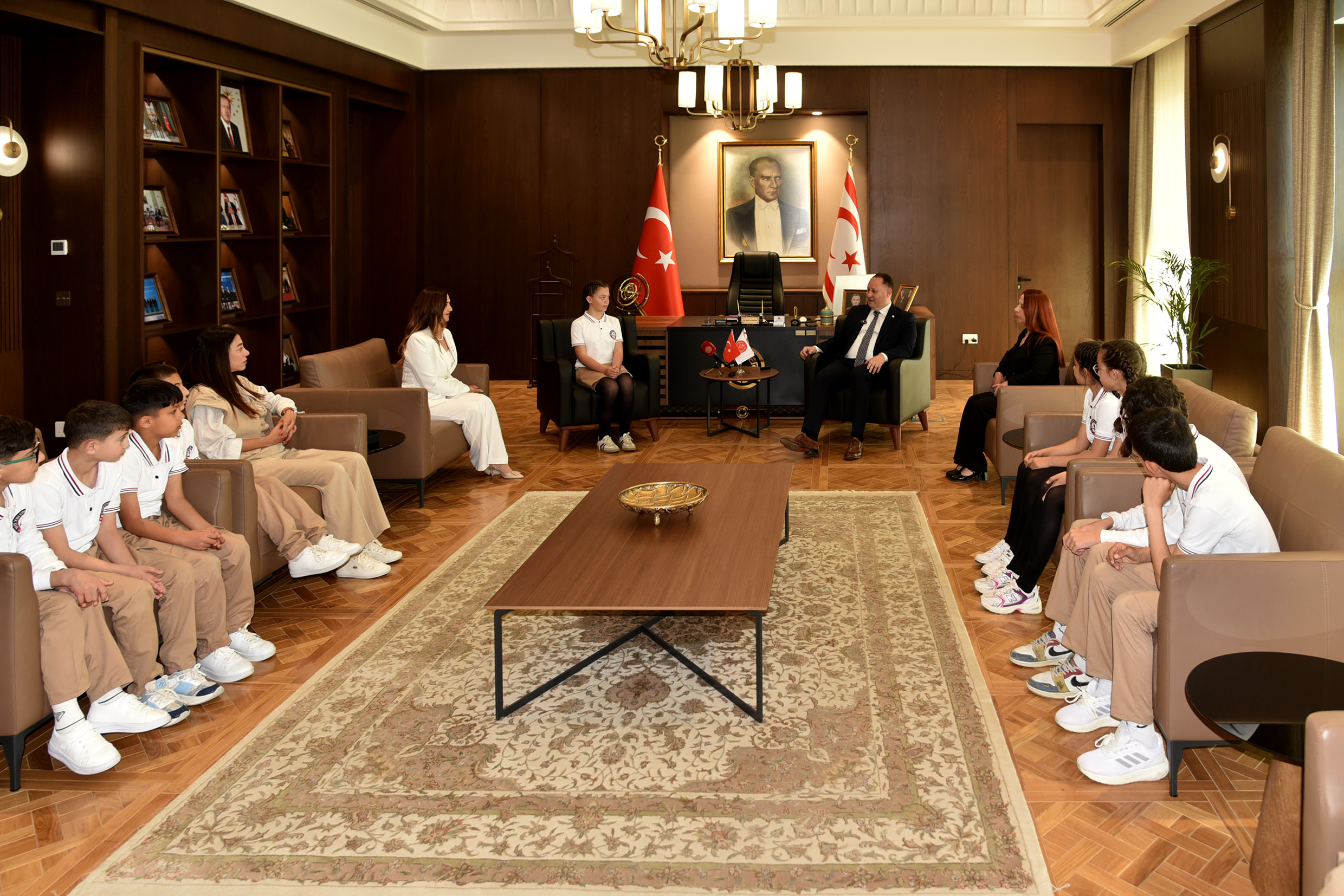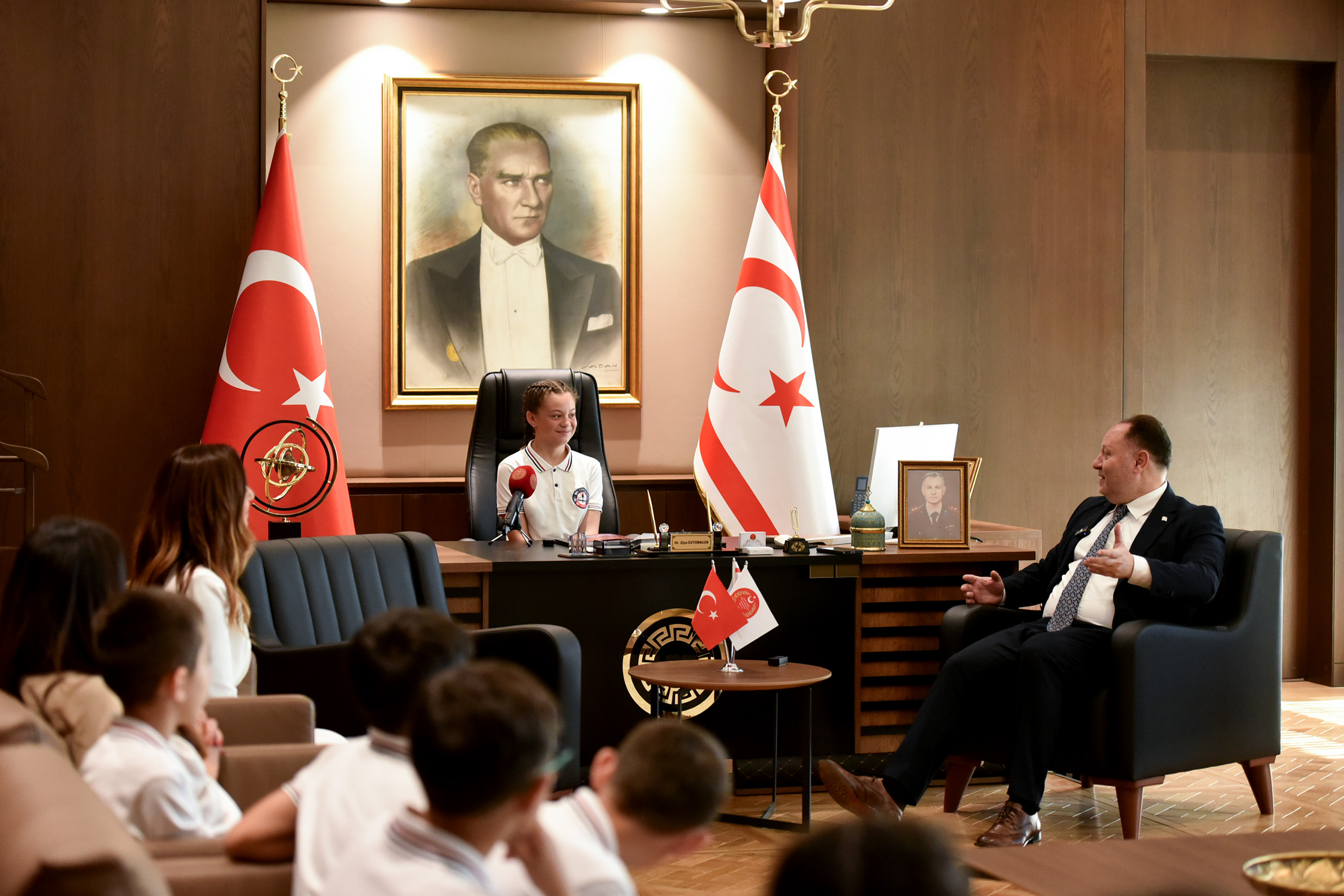 Lefkoşa, 20 Nisan 26 (TAK): Cumhuriyet Meclisi Başkanı Ziya Öztürkler, 23 Nisan Ulusal Egemenlik ve Çocuk Bayramı nedeniyle  Şht. Yalçın İlkokulu öğrenci ve öğretmenlerini kabul ederek, makamını temsili olarak 5. sınıf öğrencisi Raya Dalay’a devretti.