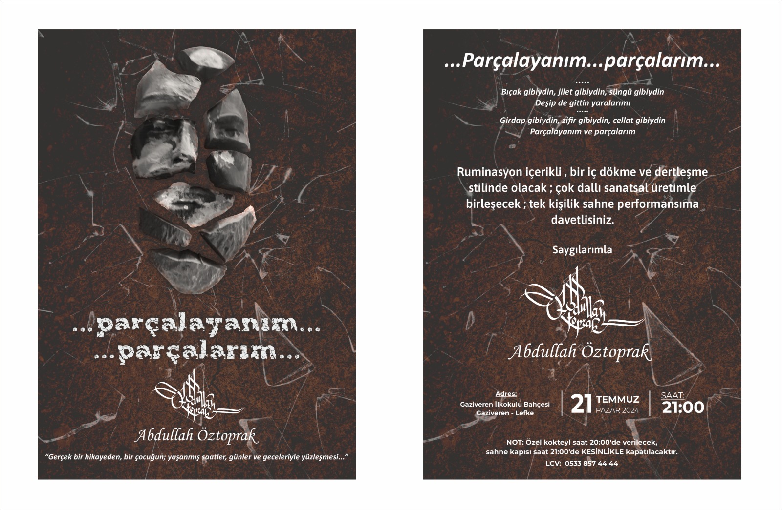 Lefkoşa, 16 Temmuz 24 (TAK): Abdullah Öztoprak, kendi yazmış olduğu tek kişilik oyunu "Parçalayanım, Parçalarım"ı pazar günü Gaziveren'de sahneleyecek.