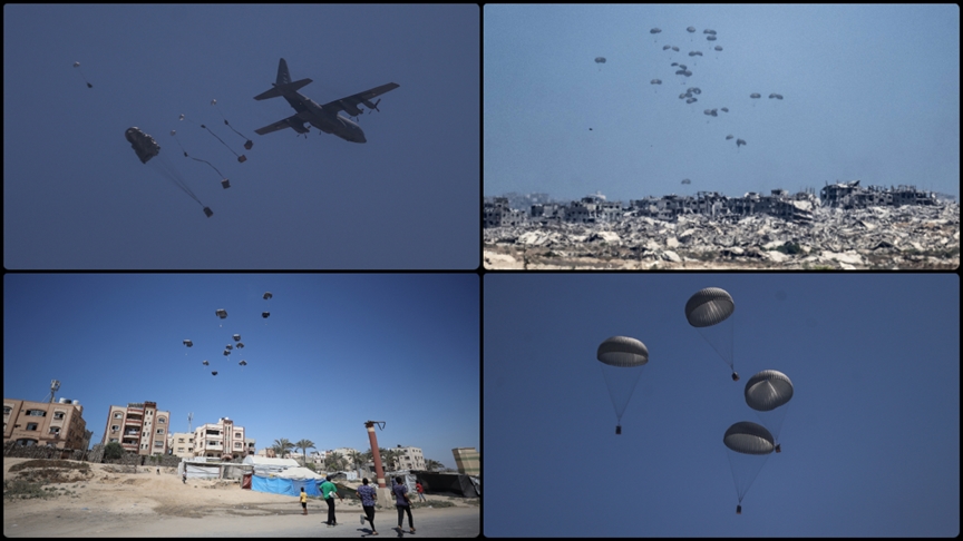 nedeniyle kıtlıkla boğuşan Gazze'ye havadan yardım malzemesi ulaştırdı.