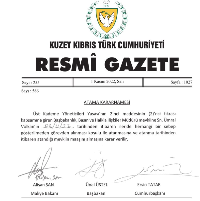 Lefkoşa, 2 Kasım 22 (TAK): Başbakanlık Basın ve Halkla İlişkiler Müdürlüğü’ne Ümral Volkan atandı.