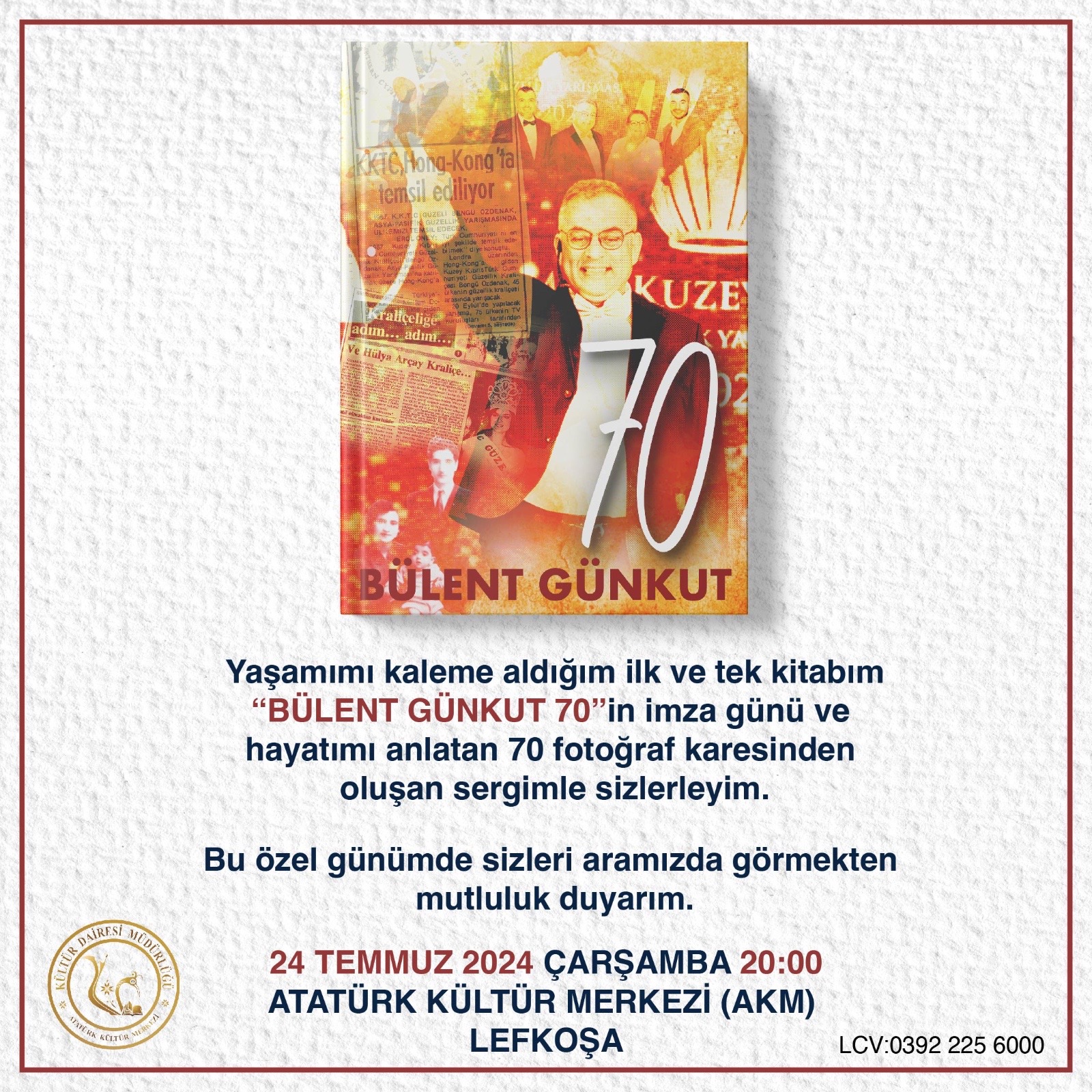 Lefkoşa, 17 Temmuz 24 (TAK): Bülent Günkut'un 70 yıllık yaşamını konu alan kitabı 24 Temmuz’da tanıtılacak, fotoğraf sergisi de aynı gün açılacak.