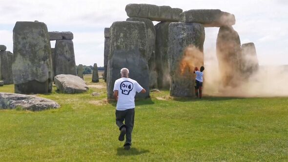 Londra, 19 Haziran 24 (TAK): Çevre aktivistleri, dünyanın en önemli arkeolojik alanlarından İngiltere'de bulunan Stonehenge'deki dikili taşlara turuncu boya püskürterek eylem düzenledi.