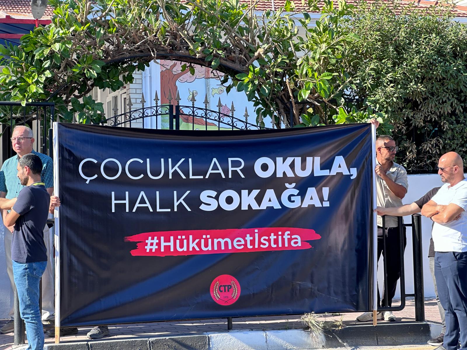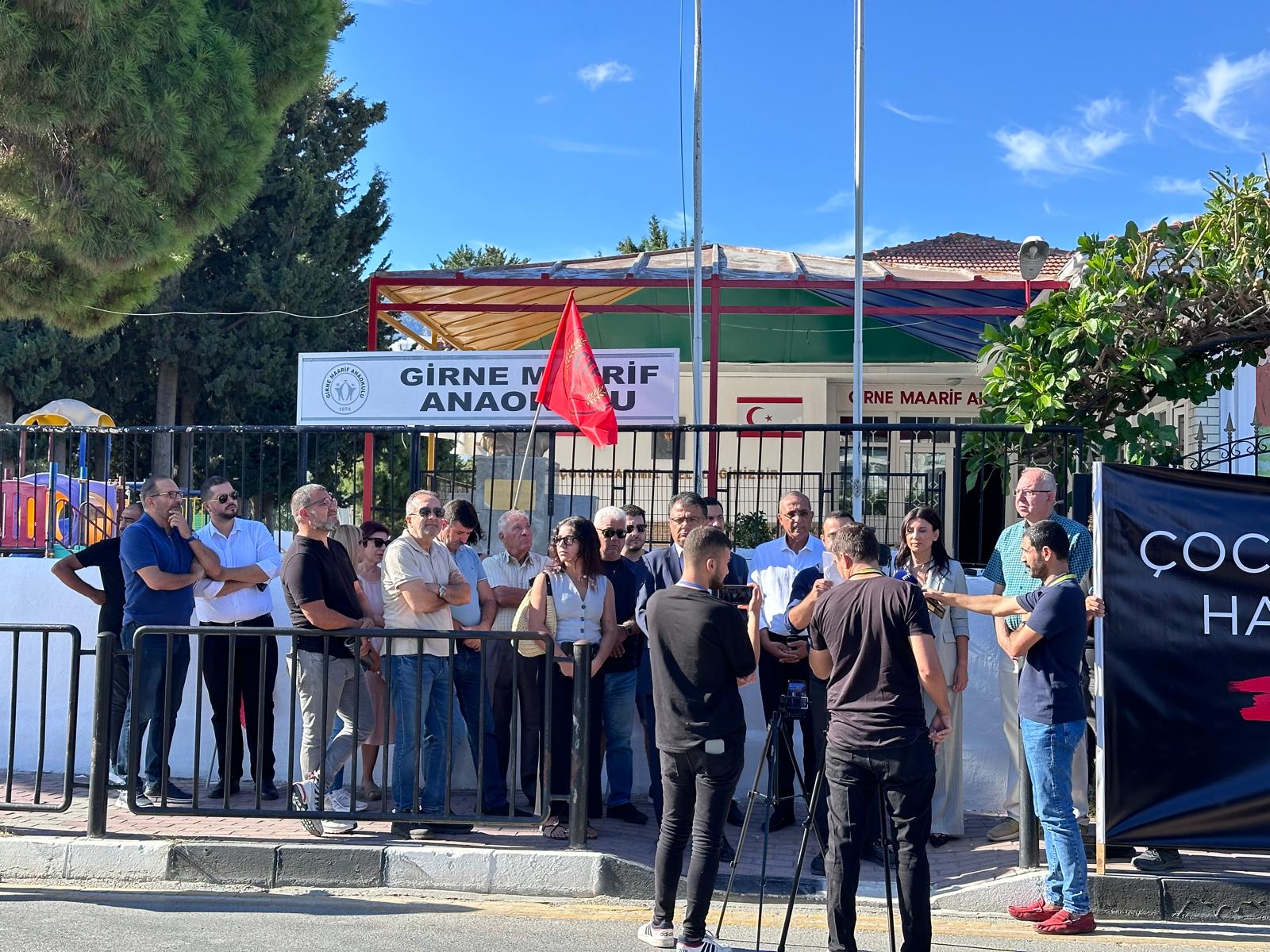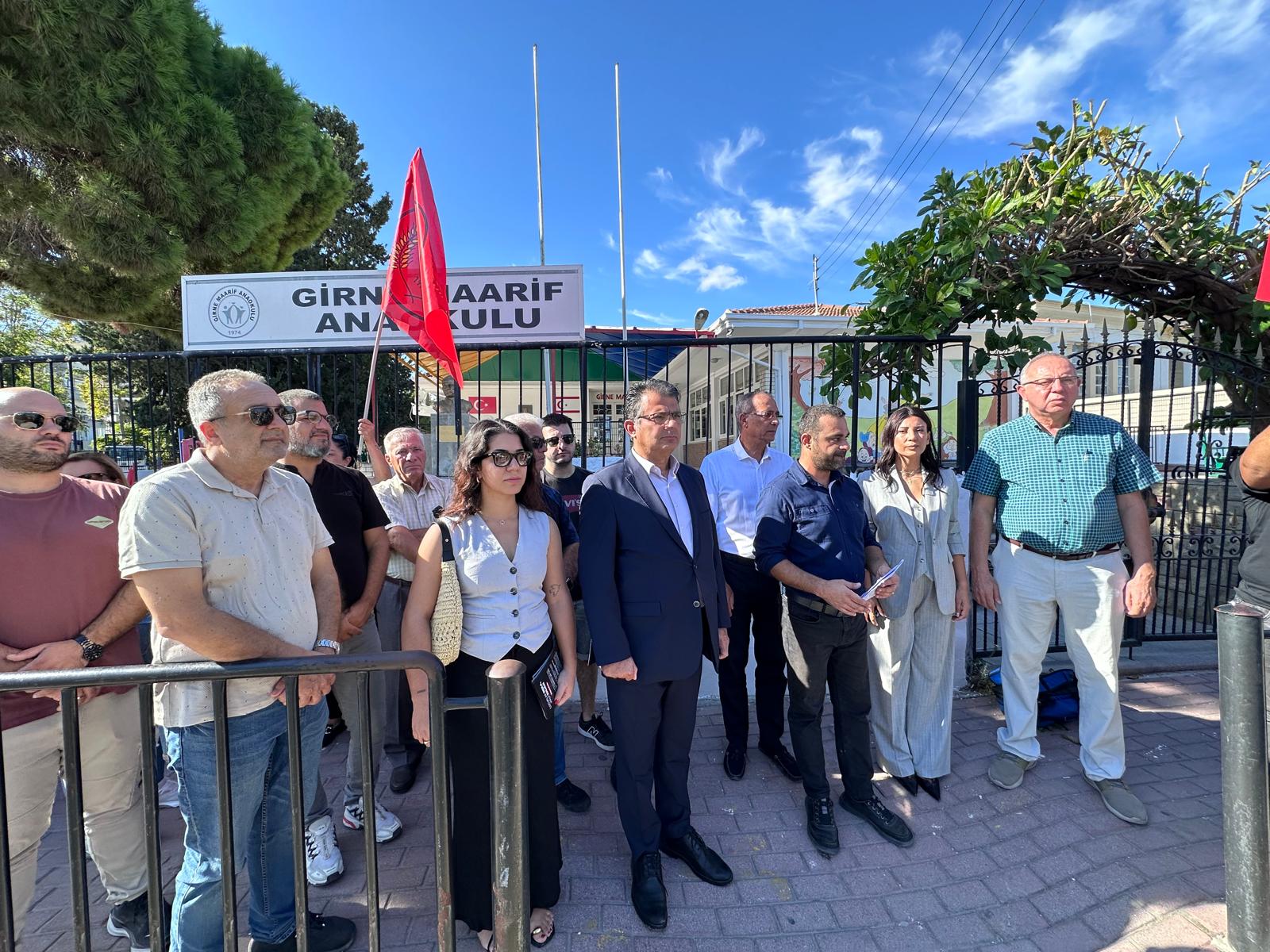 Lefkoşa, 18 Eylül 24 (TAK): Cumhuriyetçi Türk Partisi (CTP), okullarda yaşanan sıkıntılara ve okulların açılmasının ertelenmesini eleştirmek amacıyla Girne Maarif Anaokulu önünde eylem yaptı.