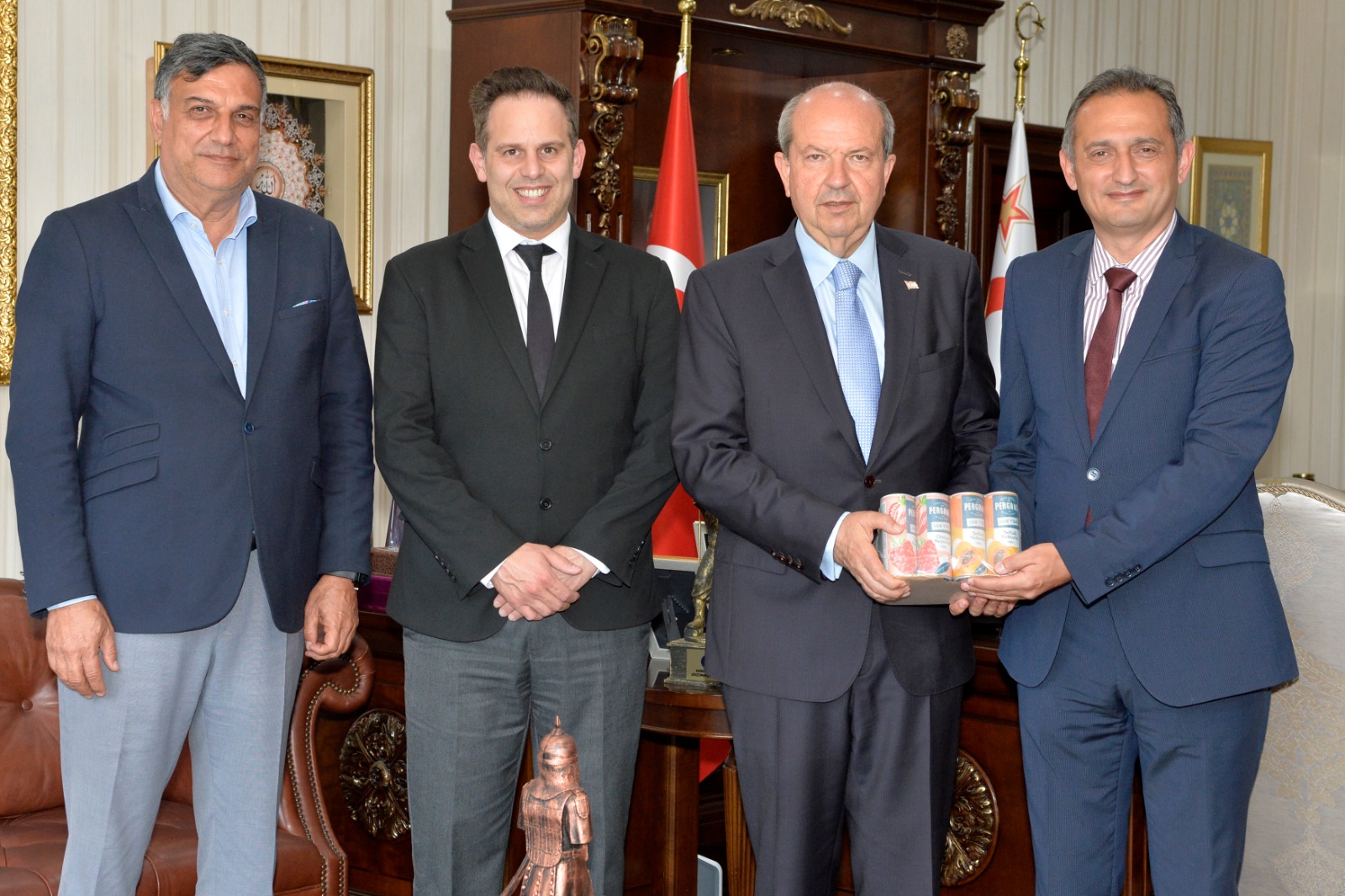 Lefkoşa, 25 Nisan 23 (TAK): Cumhurbaşkanı Ersin Tatar, Ektam Kıbrıs Ltd. Genel Müdürü Egemen Erdoğan, Direktör Kemal Şentürkler ve eski Beyarmudu Belediye Başkanı İlker Edip'i birlikte kabul etti.