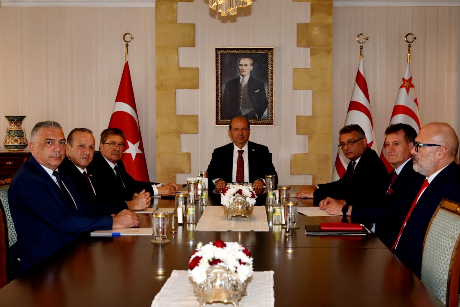 Lefkoşa, 1 Ekim 24 (TAK): Cumhurbaşkanı Ersin Tatar, New York temasları ile ilgili siyasi partileri bilgilendiriyor.