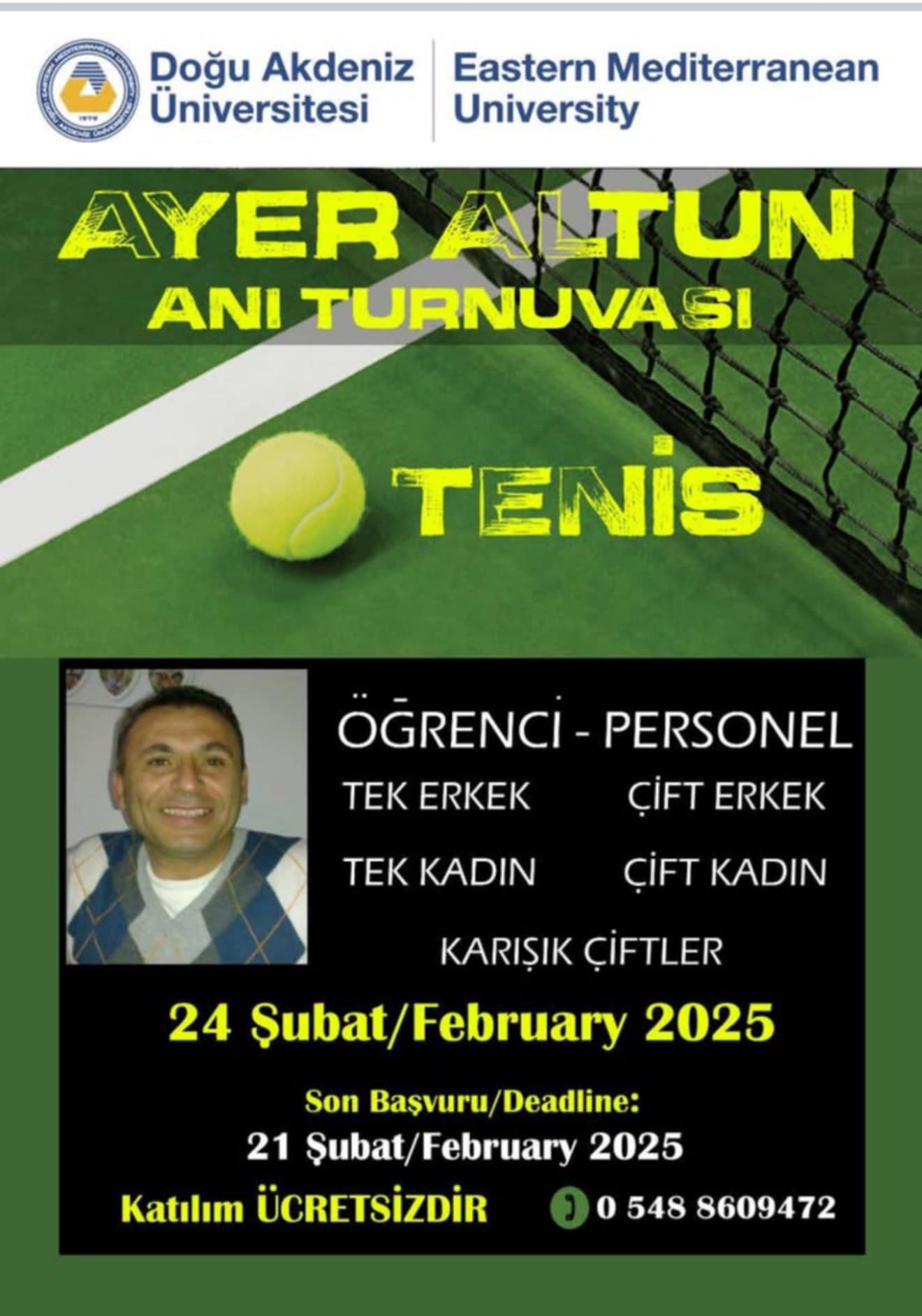 Lefkoşa, 14 Şubat 25 (TAK): Doğu Akdeniz Üniversitesi (DAÜ) Spor İşleri Müdürlüğü, hayatını kaybeden DAÜ personeli ve Şampiyon Melekler anısına "Vefa Turnuvaları" düzenliyor.