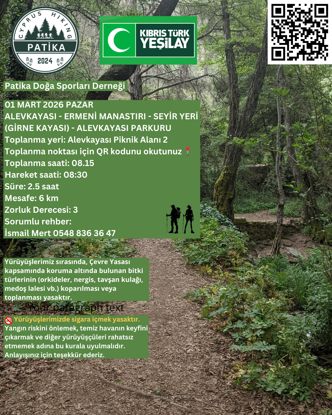Lefkoşa, 23 Şubat 26 (TAK): Patika Doğa Sporları Derneği ile Kıbrıs Türk Yeşilay Derneği, Yeşilay Haftası kapsamında farkındalık yaratmak ve sağlıklı yaşamı teşvik etmek amacıyla doğa yürüyüşü düzenliyor.
