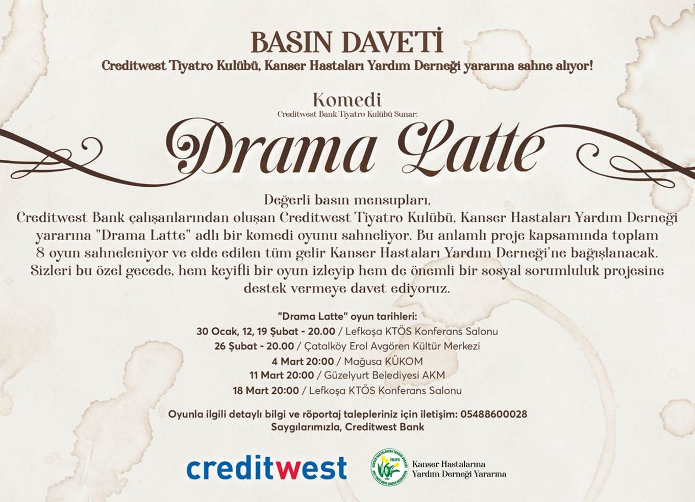 oluşan Creditwest Tiyatro Kulübü'nün Kanser Hastaları Yardım Derneği yararına sahneleyeceği “Drama