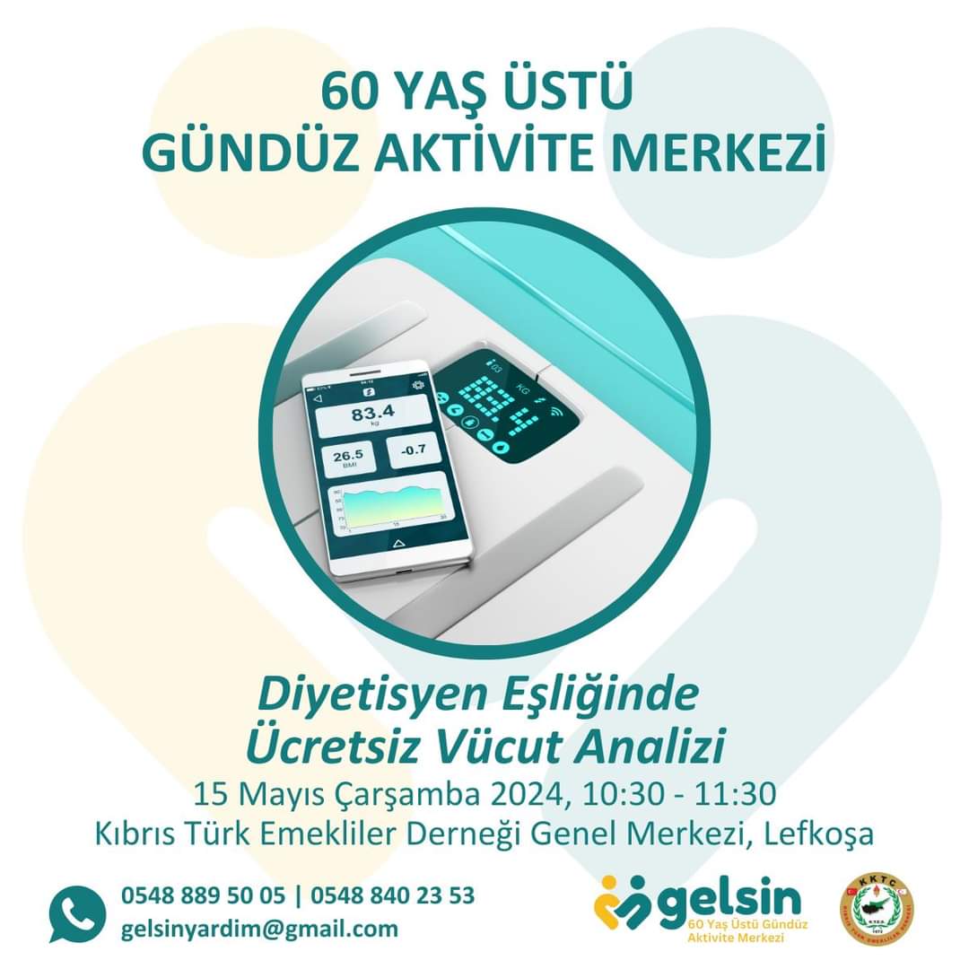 Lefkoşa, 10 Mayıs 24 (TAK): Kıbrıs Türk Emekliler Derneği ile iş birliğinde yürütülen “Gelsin 60 Yaş Üstü Aktivite Merkezi” hizmetleri kapsamında diyetisyen eşliğinde ücretsiz vücut analizi yapılacak.