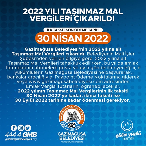 Lefkoşa, 13 Nisan 22 (TAK): Gazimağusa Belediyesi’nin 2022 yılına ait Taşınmaz Mal Vergileri çıkarıldı.