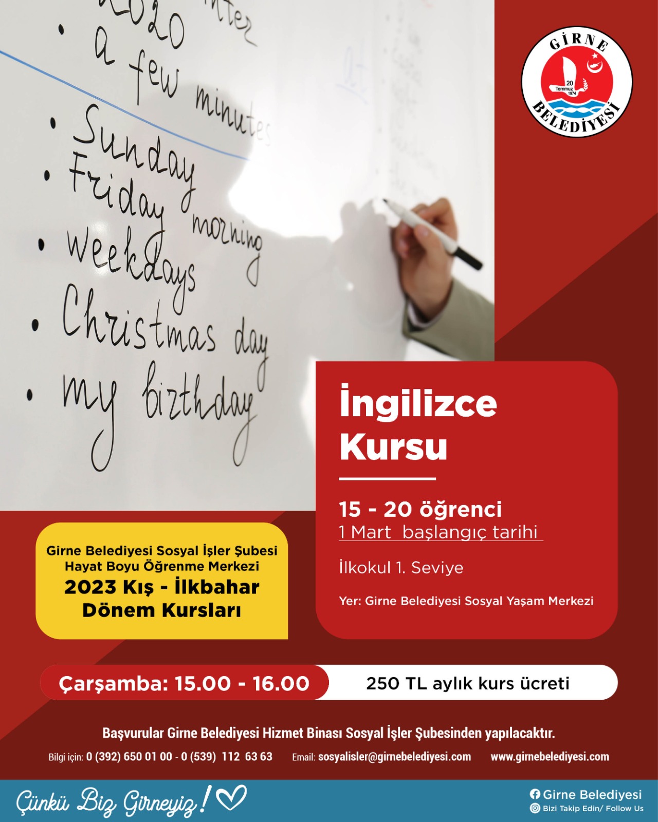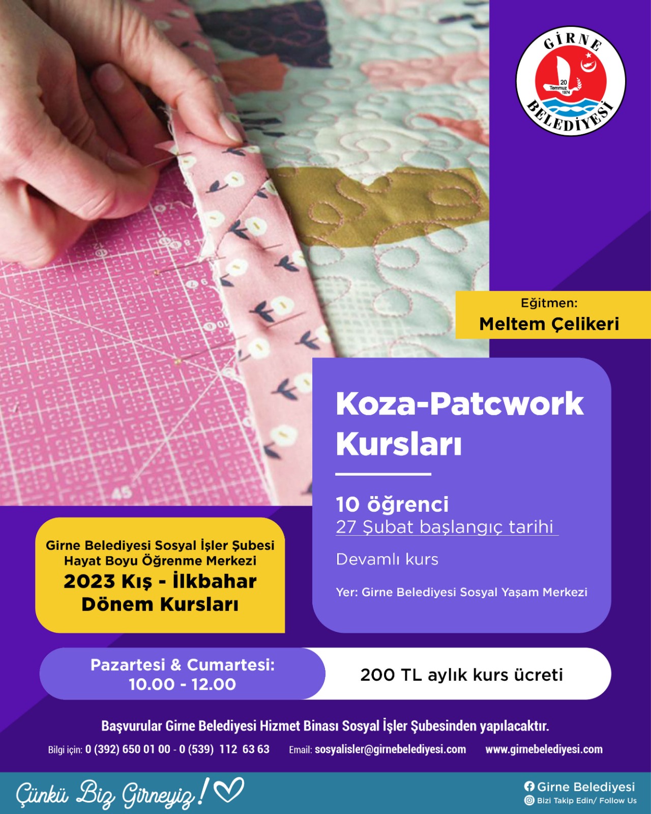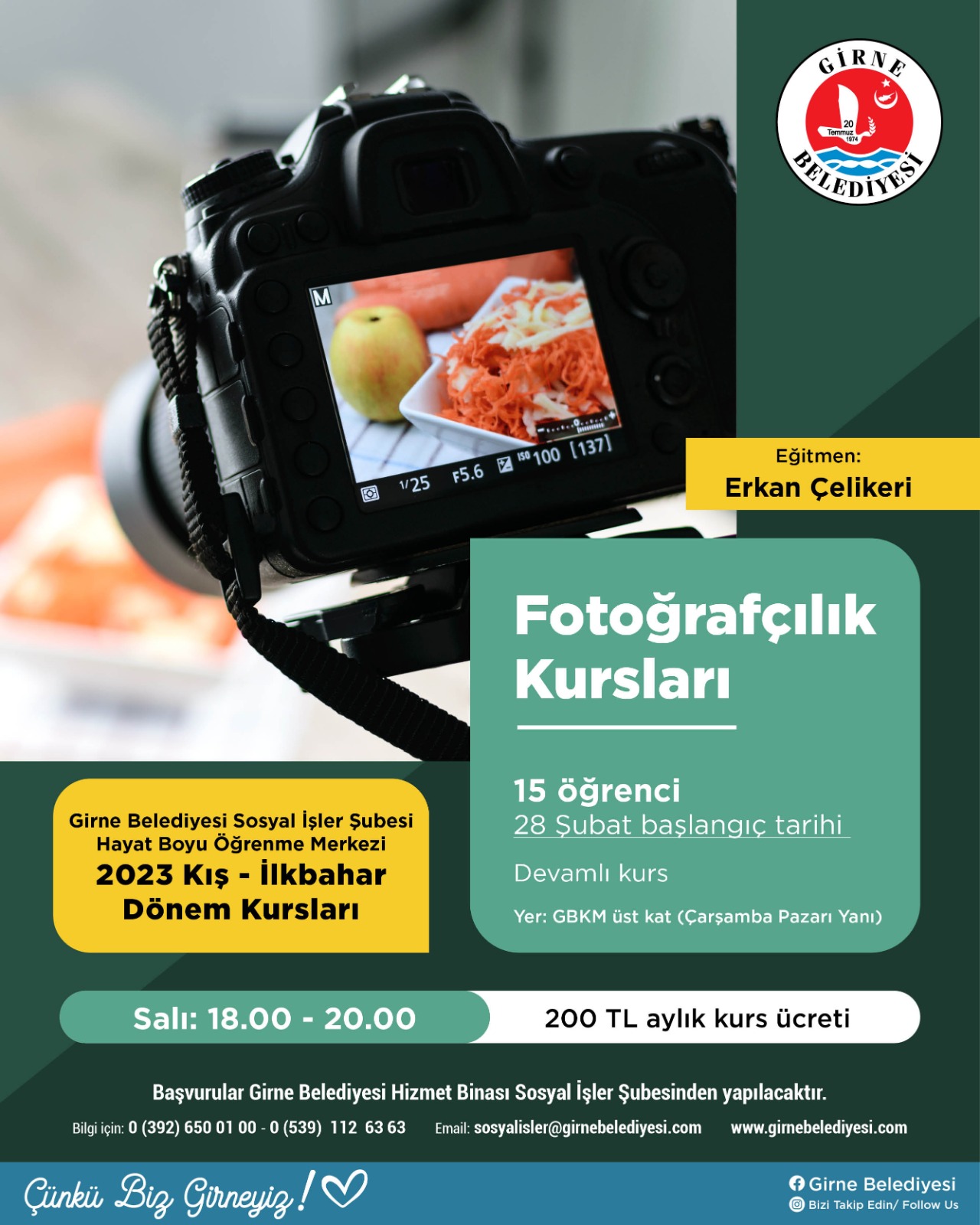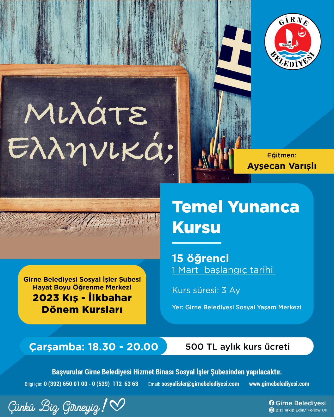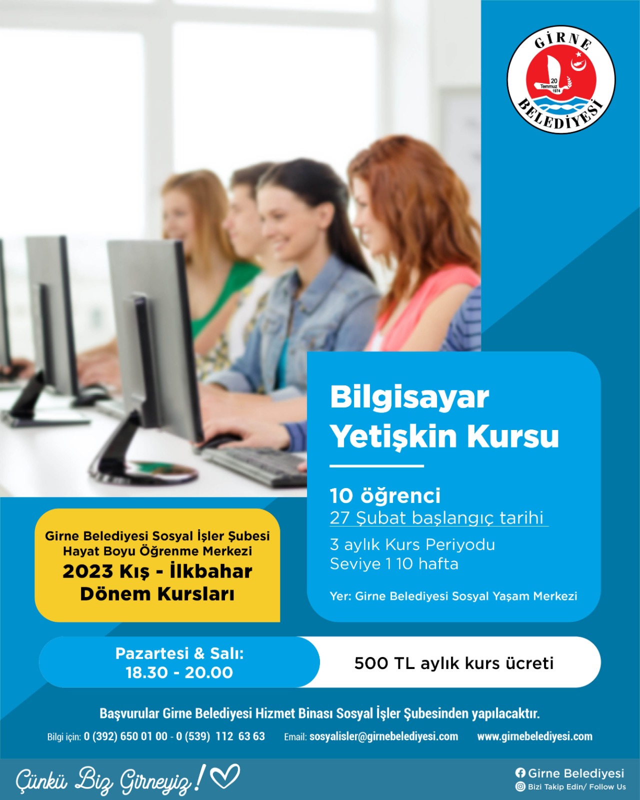 Lefkoşa, 3 Şubat 23 (TAK): Girne Belediyesi Sosyal İşler Şubesi Hayat Boyu Öğrenme Merkezi, 2023 Kış-İlkbahar Dönemi Kursları çerçevesinde 7 farklı kurs başlatıyor.