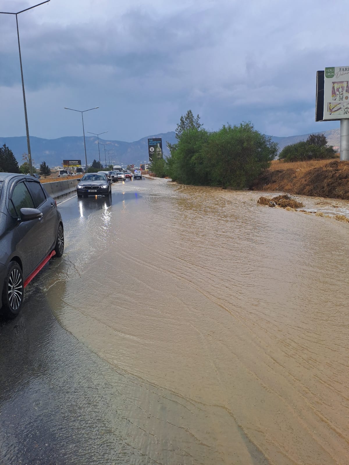sağanak sonucu yol içerisinde biriken yağmur suları nedeniyle yolun