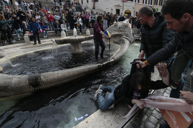 Roma, 21 Mayıs 23 (TAK): İklim aktivistleri, İtalya'nın başkenti Roma'daki dünyaca ünlü tarihi Trevi Çeşmesi'ne kömür bazlı siyah renkte bir sıvı dökerek protesto eylemi yaptı.