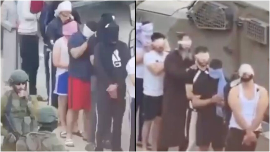 askerlerinin evlerinden çıkardığı Filistinlileri, elleri ve gözleri bağlı