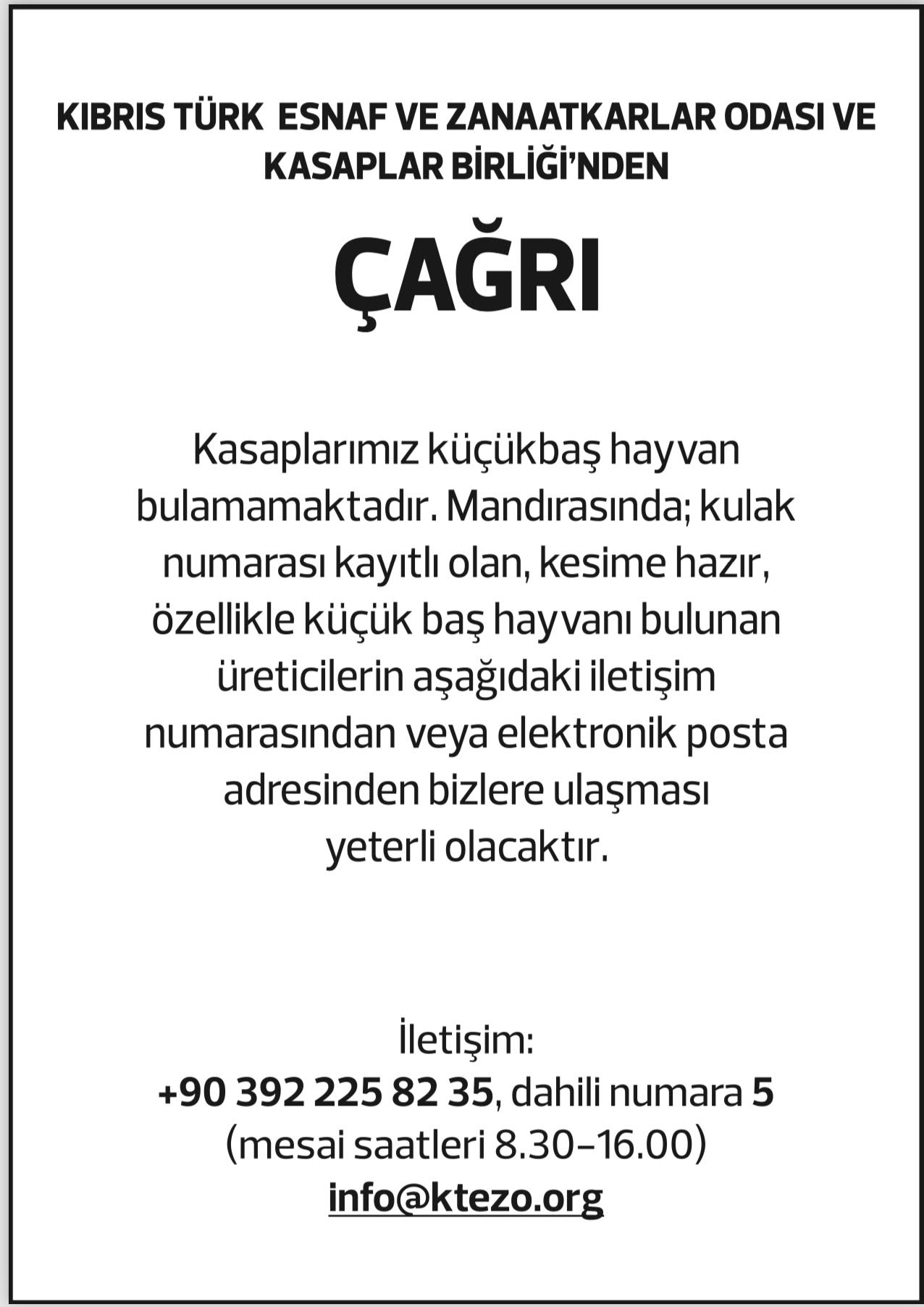 Lefkoşa, 6 Mayıs 24 (TAK): Kıbrıs Türk Esnaf ve Zanaatkarlar Odası (KTEZO) ve Kasaplar Birliği, kasapların küçükbaş hayvan bulamadığını kaydederek, küçükbaş hayvanı olan üreticilere çağrıda bulundu.