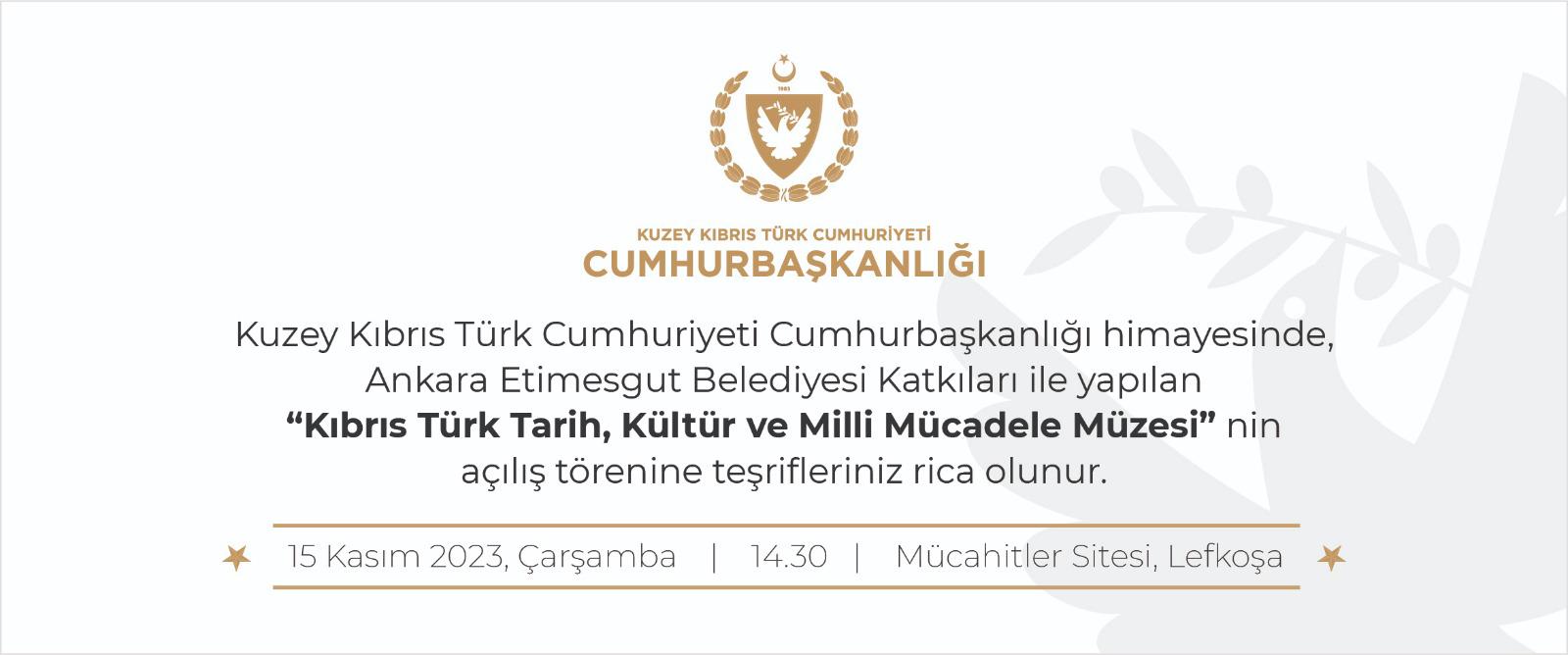 Lefkoşa, 10 Kasım 23 (TAK): Cumhurbaşkanlığı, Lefkoşa Mücahitler Sitesi’nde oluşturulan Kıbrıs Türk Tarih, Kültür ve Milli Mücadele Müzesi'nin 15 Kasım’da açılacağını duyurdu.