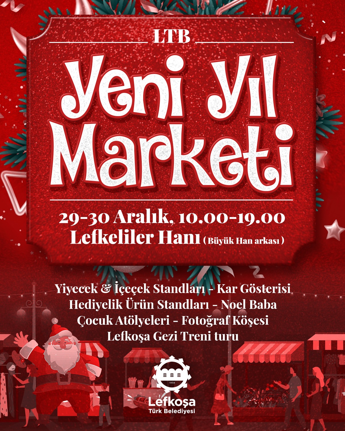 Lefkoşa, 27 Aralık 23 (TAK): Lefkoşa Türk Belediyesi (LTB), Cuma ve Cumartesi günü Lefkeliler Hanı’nın bulunduğu alanda Yeni Yıl Marketi düzenleyecek.