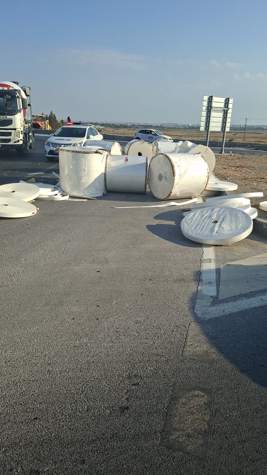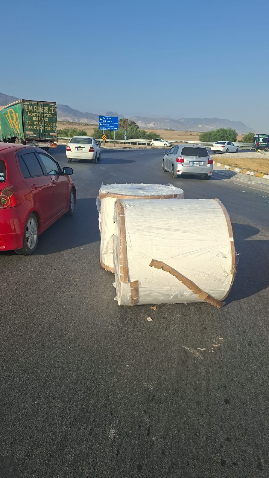Lefkoşa, 5 Eylül 25 (TAK): Polis, Gazimağusa Lefkoşa ana yolu Halkbank çemberinde tırdan yola devrilen kağıt rulo balyalar konusunda sürücüleri uyardı.