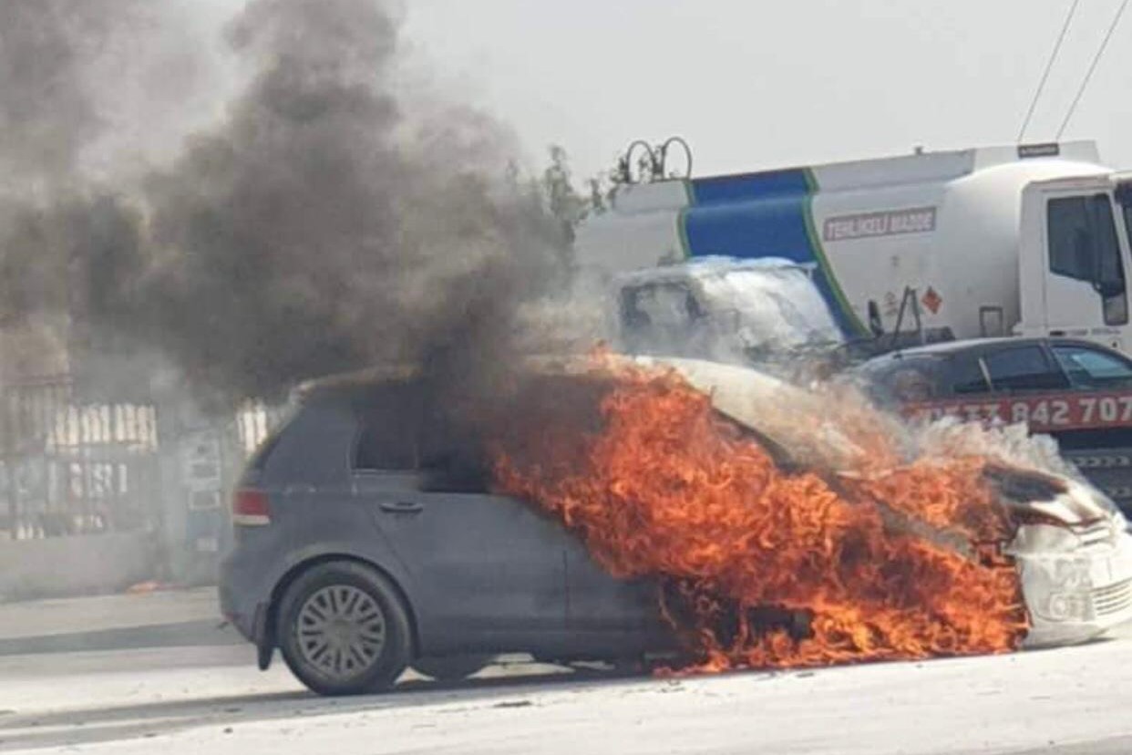 Lefkoşa, 1 Kasım 2022 (TAK) Gazimağusa Lefkoşa ana yolunda seyir halindeki araç, tespit edilemeyen nedende dolayı yandı.