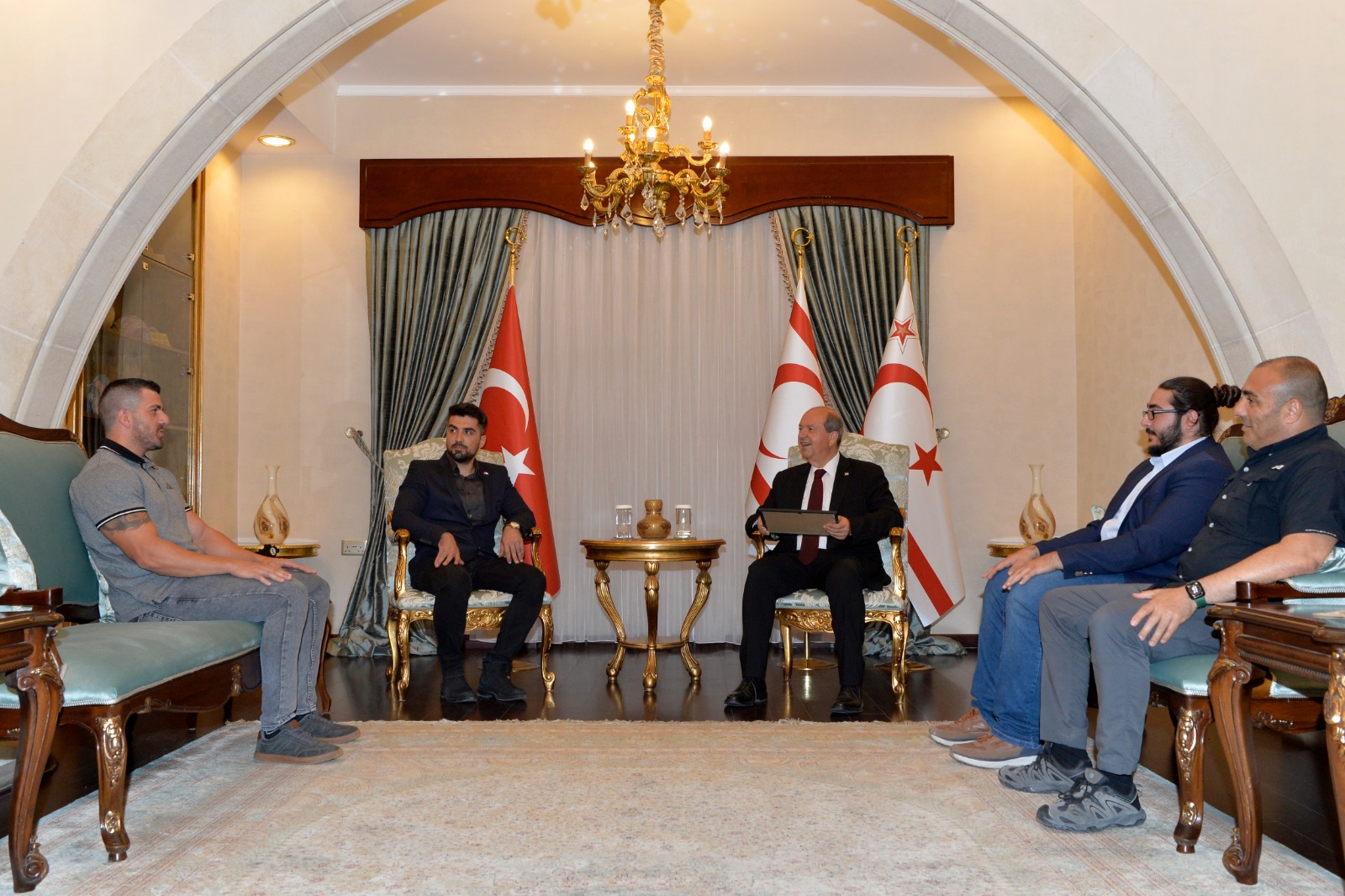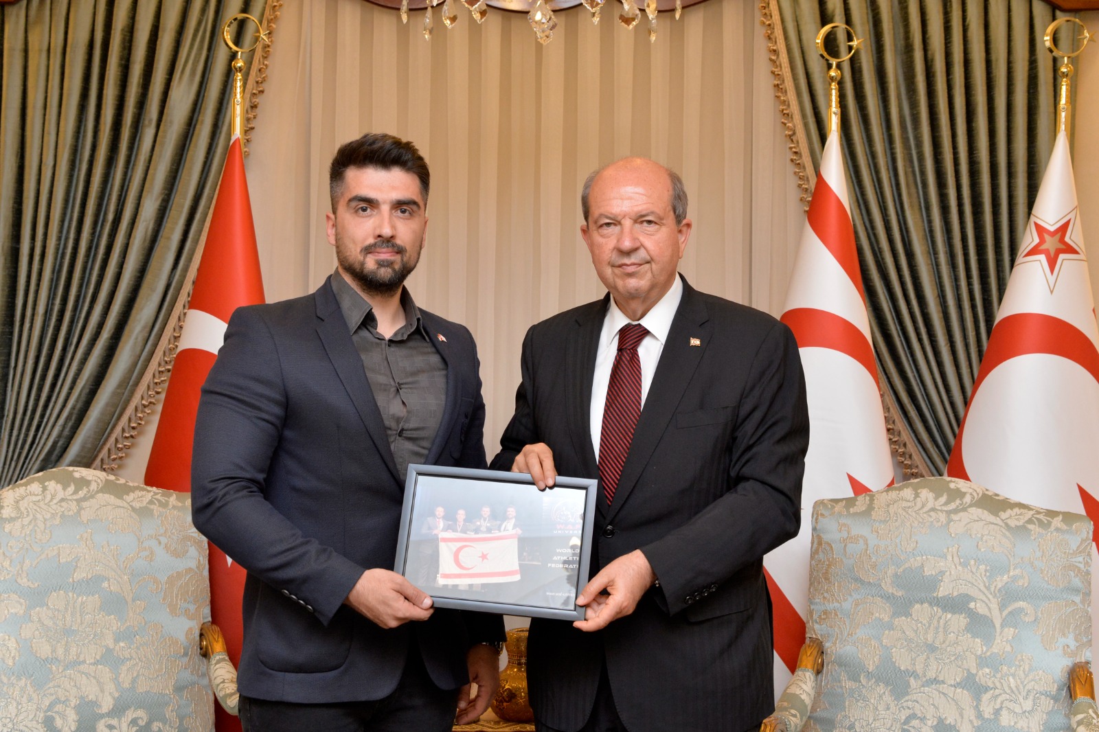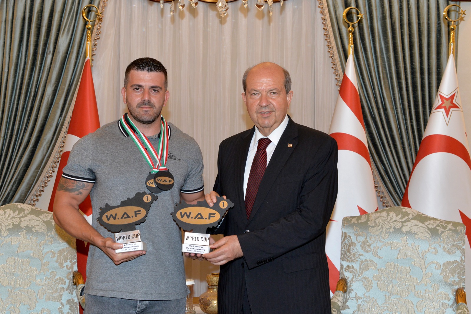 Lefkoşa, 10 Mayıs 24 (TAK): Cumhurbaşkanı Ersin Tatar, W.A.F. UNIVERSE Vücut Geliştirme ve Fitness Dünya Şampiyonası'nda iki farklı kategoride şampiyonluk elde eden Salahi Avcı ve beraberindeki heyeti kabul etti.