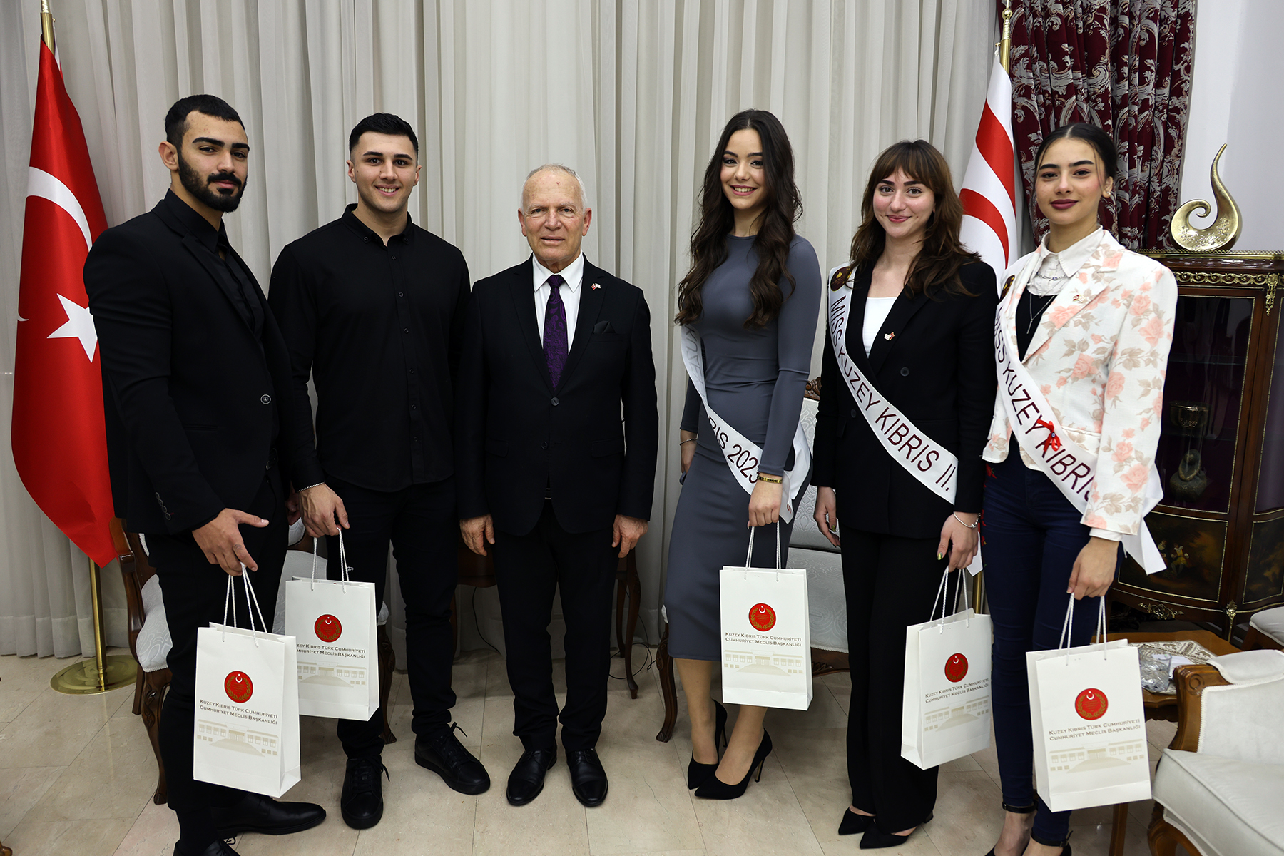 Lefkoşa, 14 Şubat 24 (TAK): Cumhuriyet Meclisi Başkanı Zorlu Töre, 2023 Miss Kuzey Kıbrıs ve Bay Kuzey Kıbrıs finalistlerini Meclis Şeref Salonunda kabul etti.