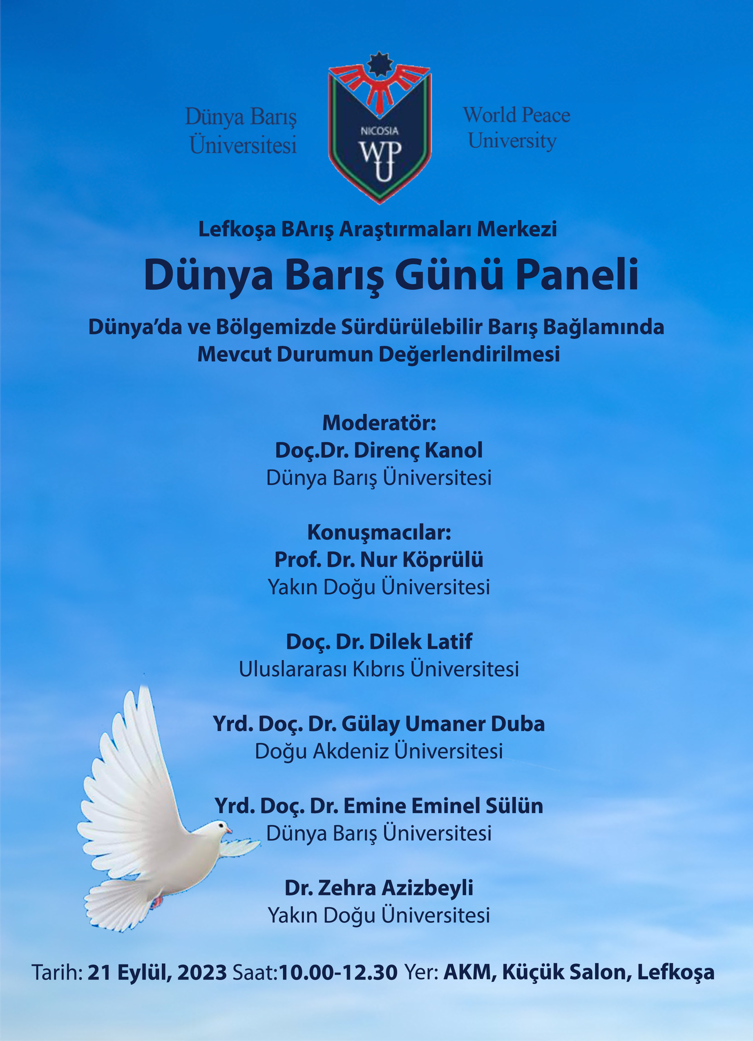 Lefkoşa, 20 Eylül 23 (TAK): Kıbrıs Barış Araştırmaları Merkezi’nin açılış etkinliği ve “Dünya Barış Günü” paneli yarın Atatürk Kültür Merkezi (AKM) Lefkoşa’da yapılacak.