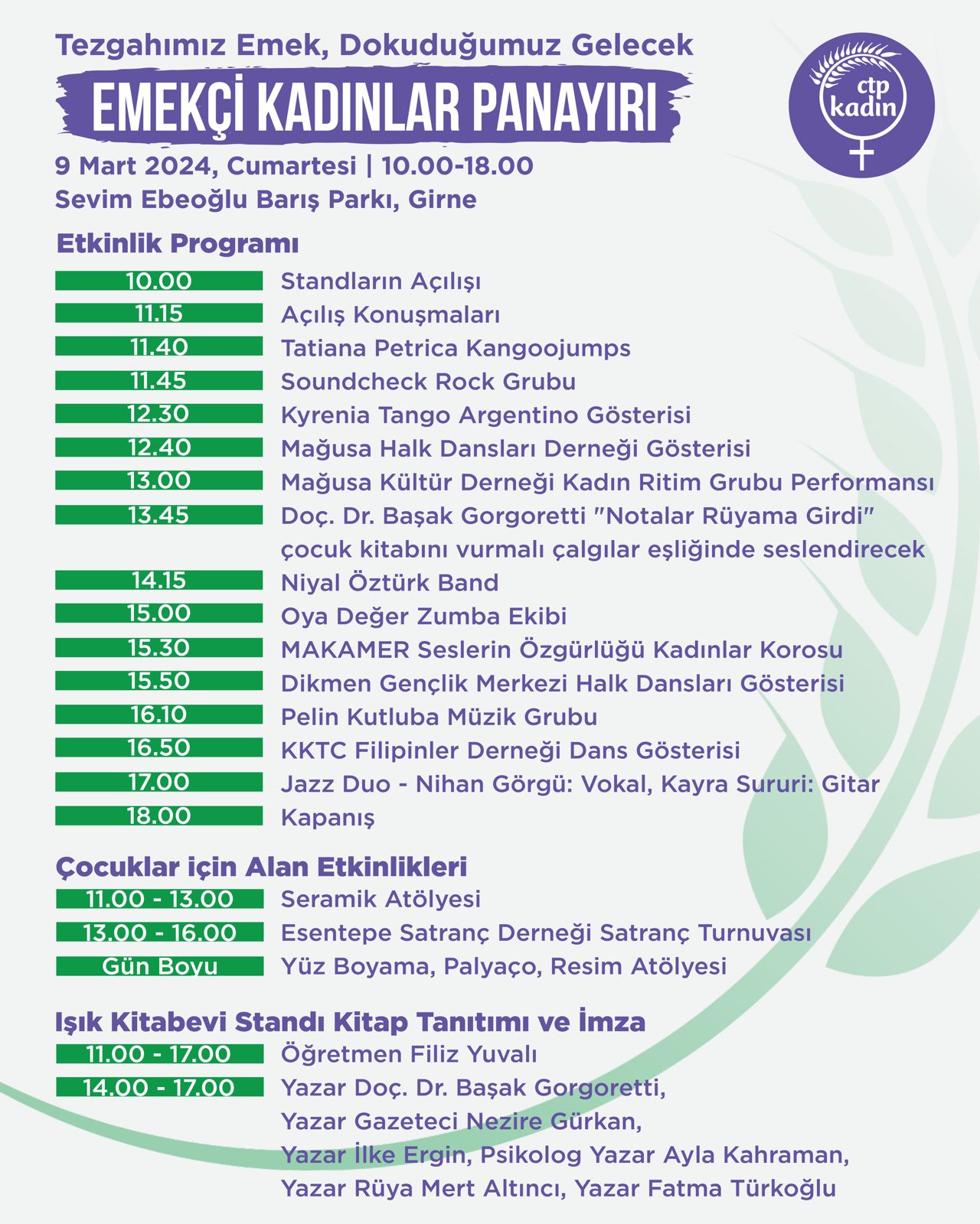 Lefkoşa, 8 Mart 24 (TAK): CTP Kadın Örgütü Girne İlçesinin gelenekselleşen Emekçi Kadınlar Panayırı "Özgürlük İrademizde" programı kapsamında yarın gerçekleşecek.