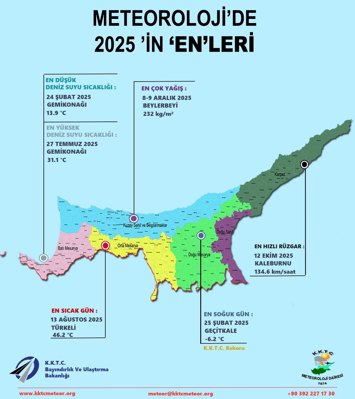 Lefkoşa, 9 Ocak 26 (TAK): Meteoroloji Daresi, 2025 yılına ilişkin yağış miktarlarıyla hava ve deniz suyu sıcaklılarında en yüksek ve en düşük değerleri açıkladı.
