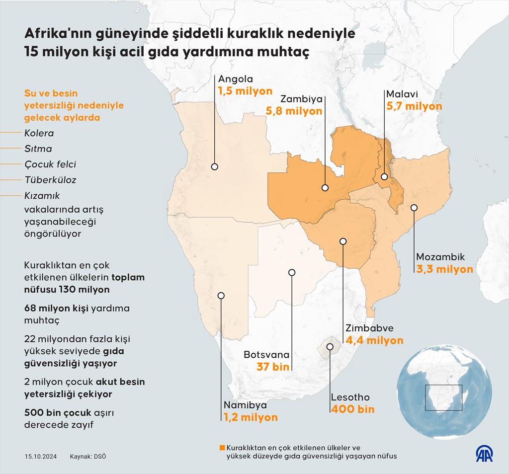 Cape Town, 15 Ekim 24 (TAK): Afrika'nın güneyinde son 40 yılın en şiddetli kuraklığından kaynaklı gıda krizi nedeniyle bölgede 15 milyon kişinin bu aydan itibaren acil gıda yardımına ihtiyaç duyduğu belirtildi.