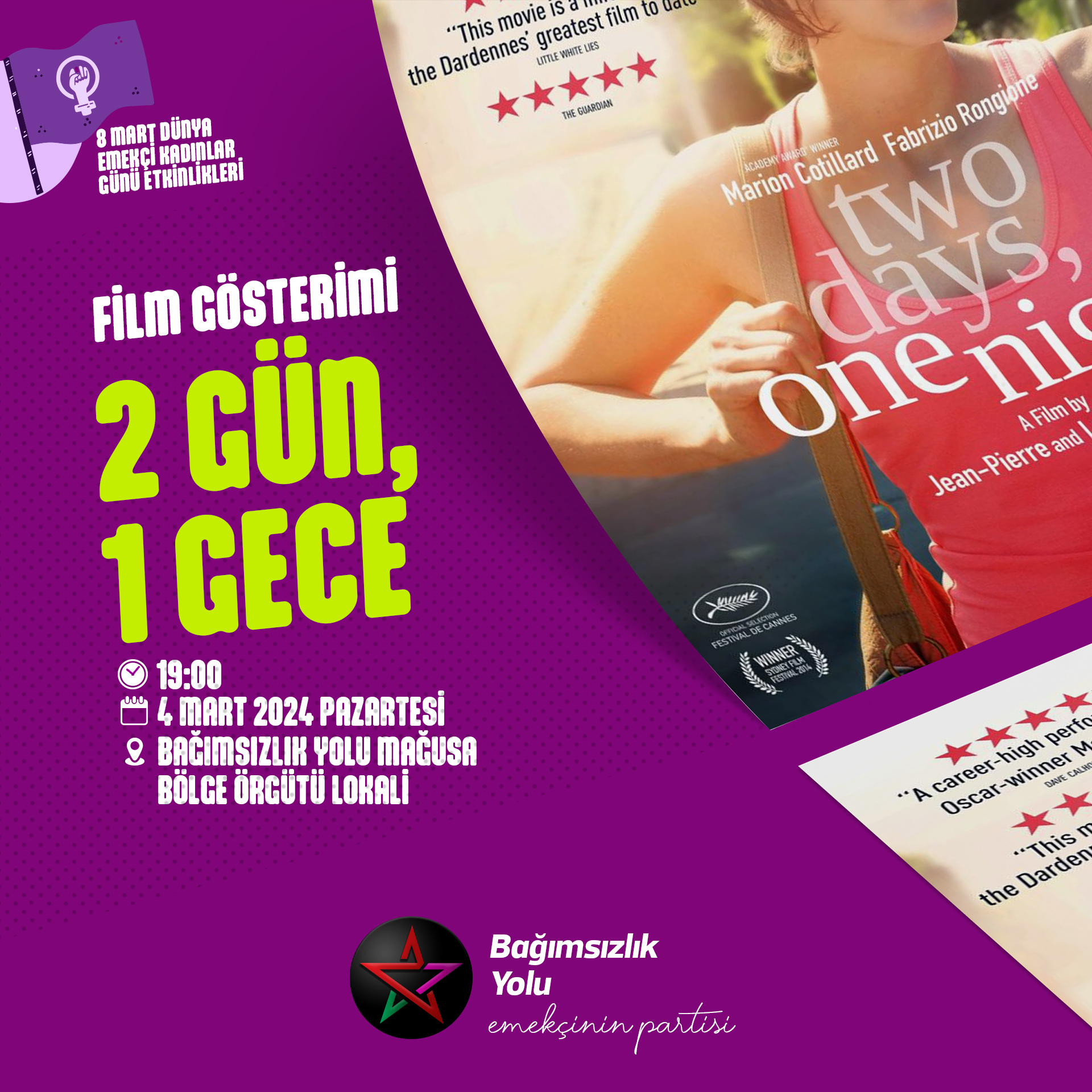 Lefkoşa, 2 Mart 24 (TAK):Bağımsızlık Yolu Mağusa Bölge Örgütü, 8 Mart Dünya Emekçi Kadınlar Günü etkinlikleri kapsamında film gösterimi düzenliyor.