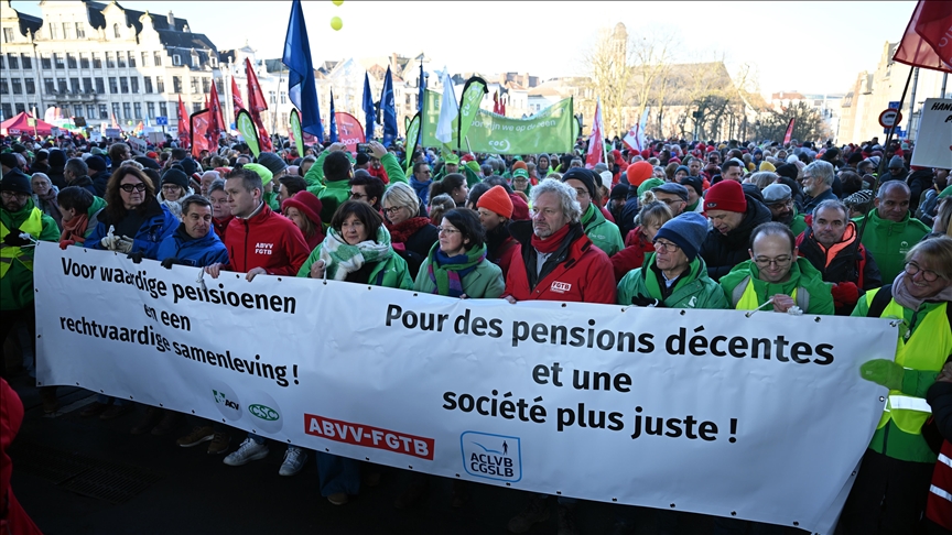 Brüksel, 13 Ocak 25 (TAK): Belçika'da çalışanlar, kurulması muhtemel yeni hükümetin emeklilik haklarında kesinti başta olmak üzere uygulayacağı çeşitli kemer sıkma politikalarına karşı gösteri düzenledi.
