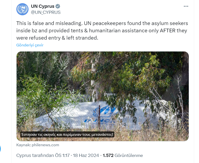 Lefkoşa, 18 Haziran 24 (TAK): Kıbrıs'taki BM Barış Gücü (BMBG), ara bölgede mahsur kalan mülteciler konusunda  internet sitesi üzerinden BMBG'ye eleştiri ve suçlamalarda bulunan Filelefteros gazetesini yalanladı.