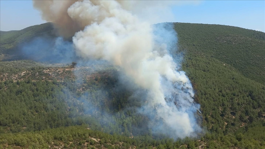 Muğla, 9 Temmuz 24 (TAK): Muğla'nın Bodrum ilçesinde çıkan orman yangınına havadan ve karadan müdahale ediliyor.