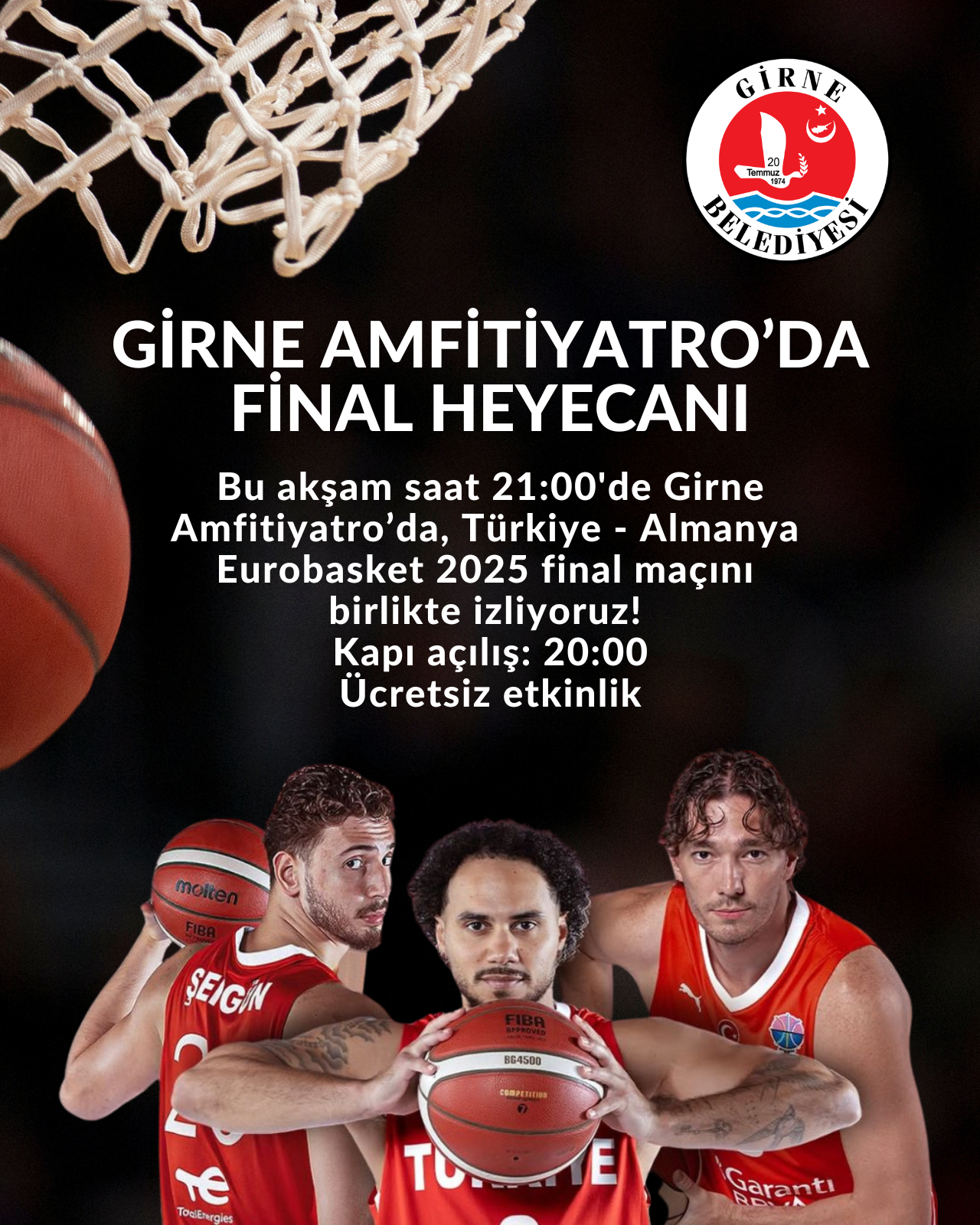 Lefkoşa, 14 Eylül 25 (TAK): Bu akşam Türkiye ile Almanya arasında oynanacak Eurobasket 2025 final maçı Girne Amfi Tiyatro’da dev ekrandan gösterilecek.