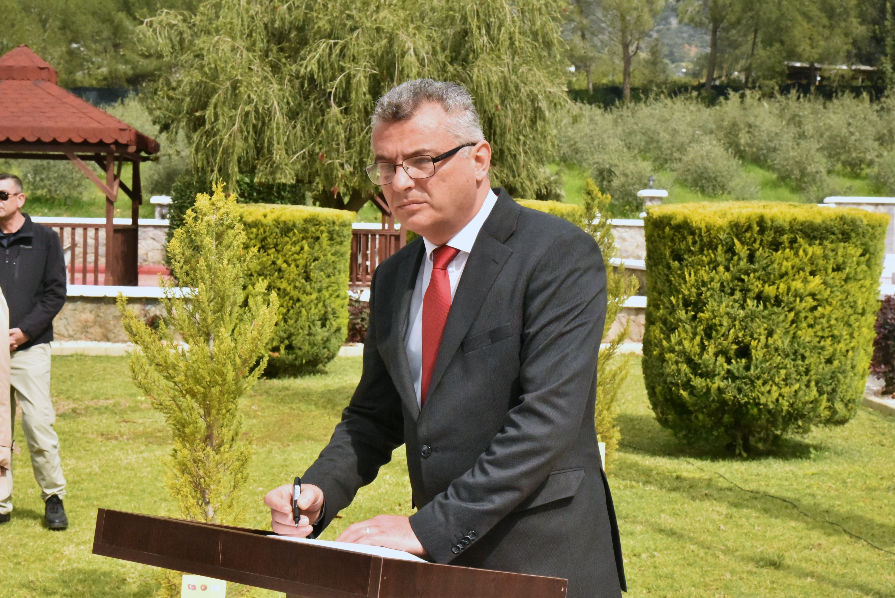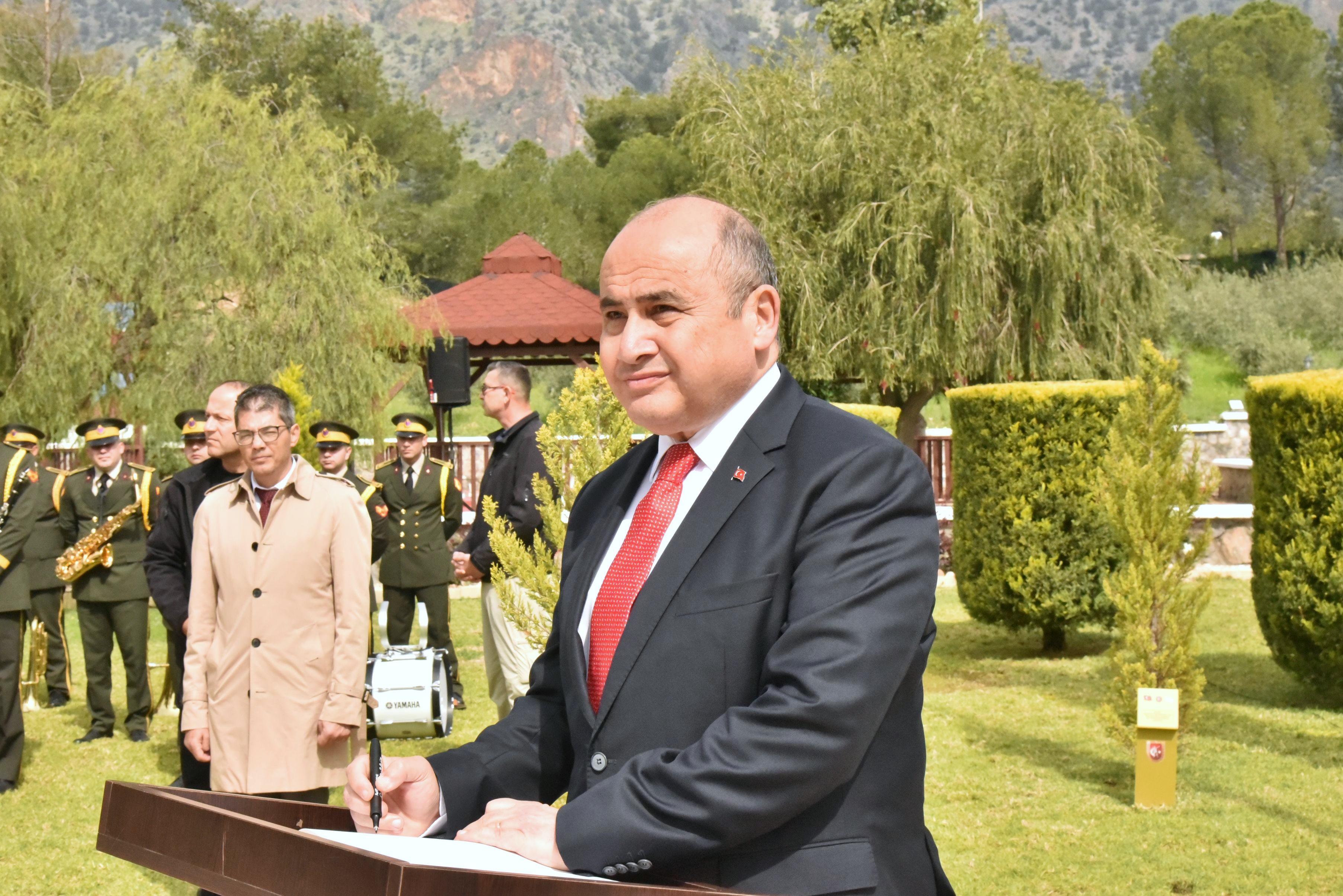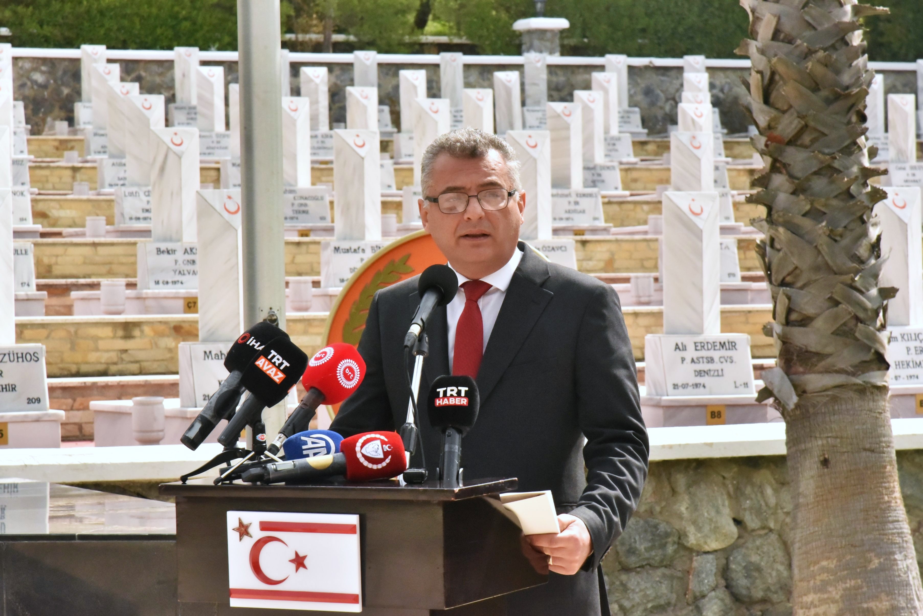 Boğaz Şehitliği’nden alınan toprak, Anıtkabir’e gönderilmek üzere Cumhurbaşkanı Erhürman tarafından Türkiye Cumhuriyeti Lefkoşa Büyükelçisi Başçeri’ye teslim edildi.
