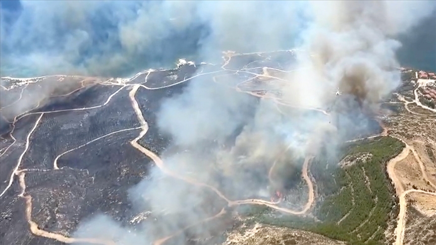 İzmir, 15 Temmuz 24 (TAK): İzmir'in Çeşme ilçesinde ormanlık alanda çıkan yangına müdahale ediliyor.
