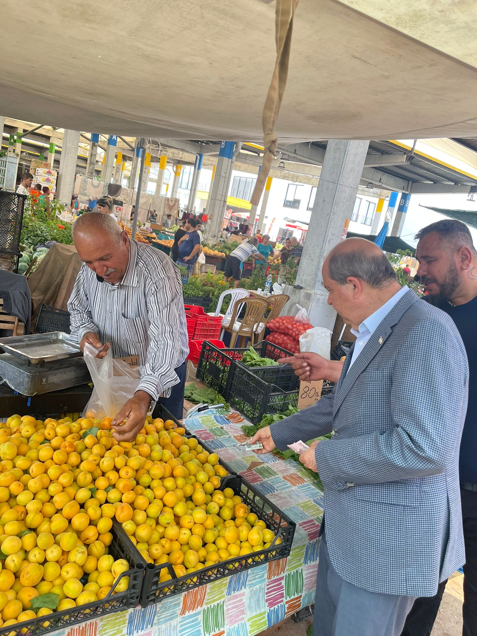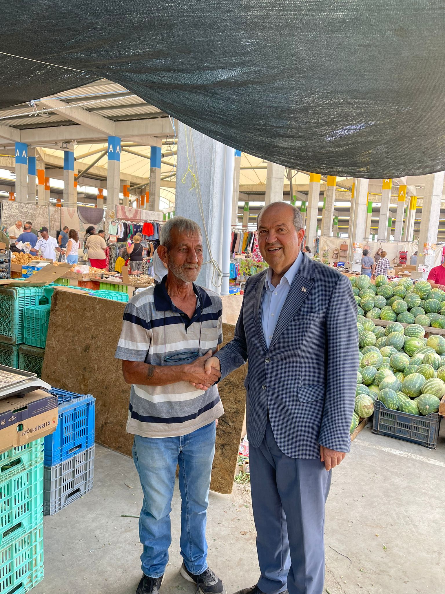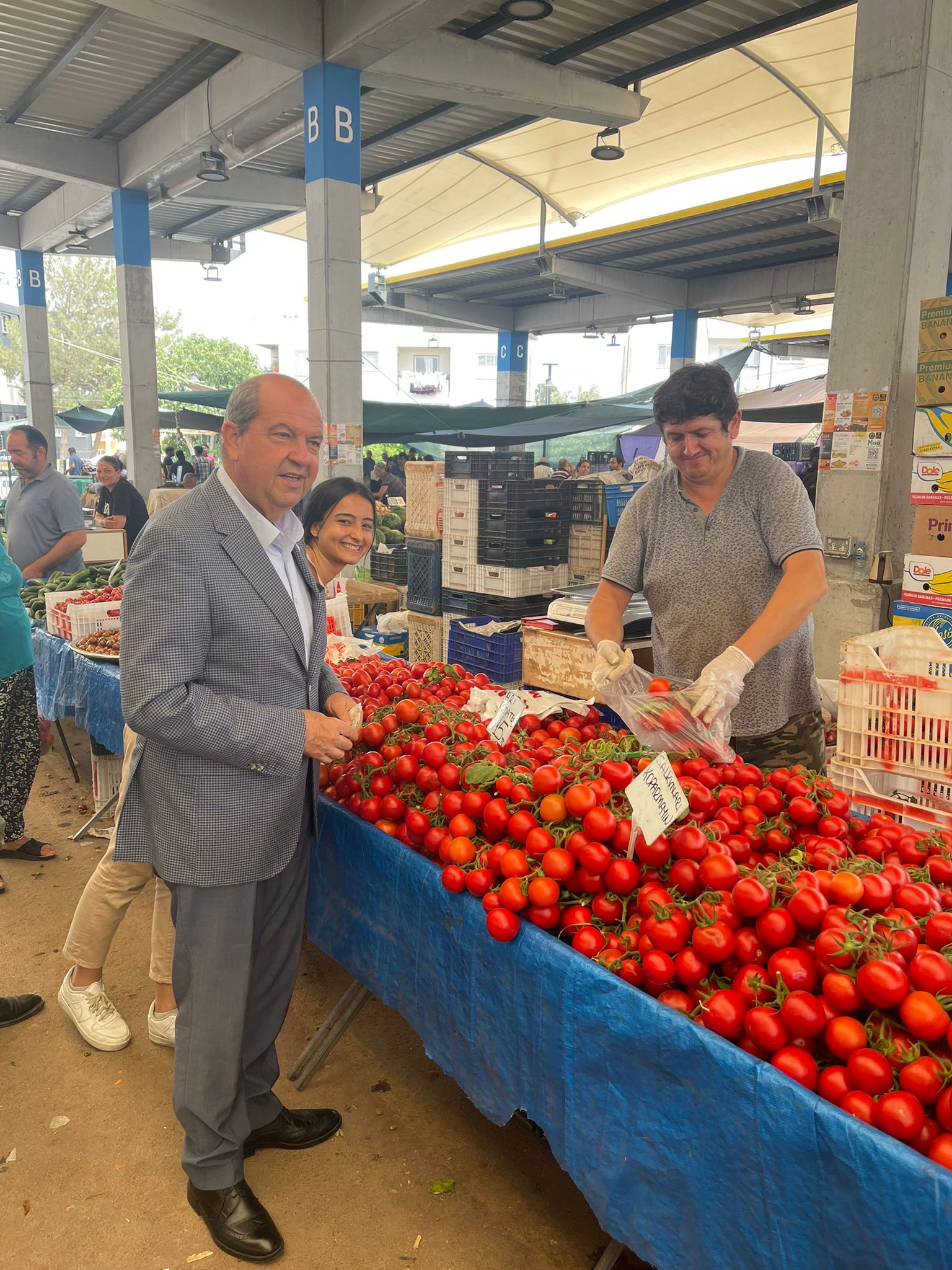Lefkoşa, 12 Haziran 22 (TAK): Cumhurbaşkanı Ersin Tatar, Lefkoşa Açık Pazar’da esnaf ve halkla bir araya geldi. Vatandaşlarla sohbet ederek pazardan alışveriş yapan Cumhurbaşkanı Tatar, esnaf ve üreticilerle de ülke gündemi ve ekonomiye dair değerlendirmelerde bulundu.