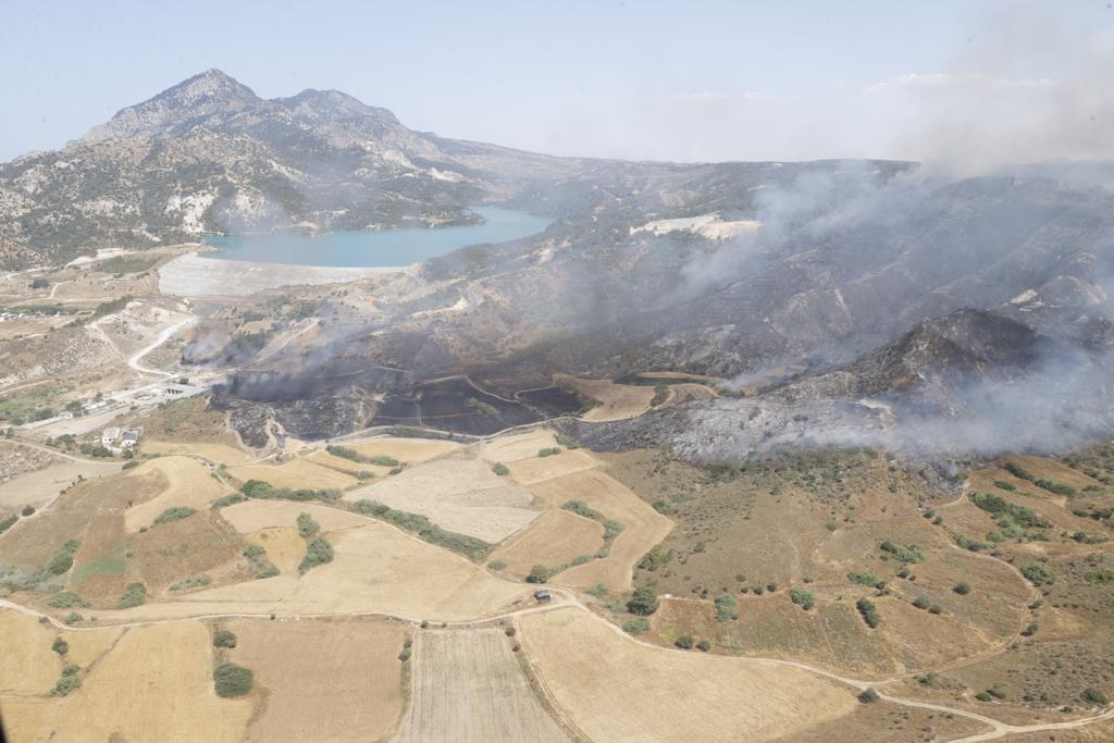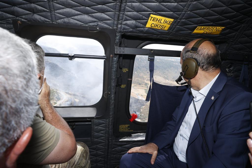 Lefkoşa, 27 Mayıs 22 (TAK): Cumhurbaşkanı Ersin Tatar, yangın bölgesinde incelemelerde bulunuyor.
