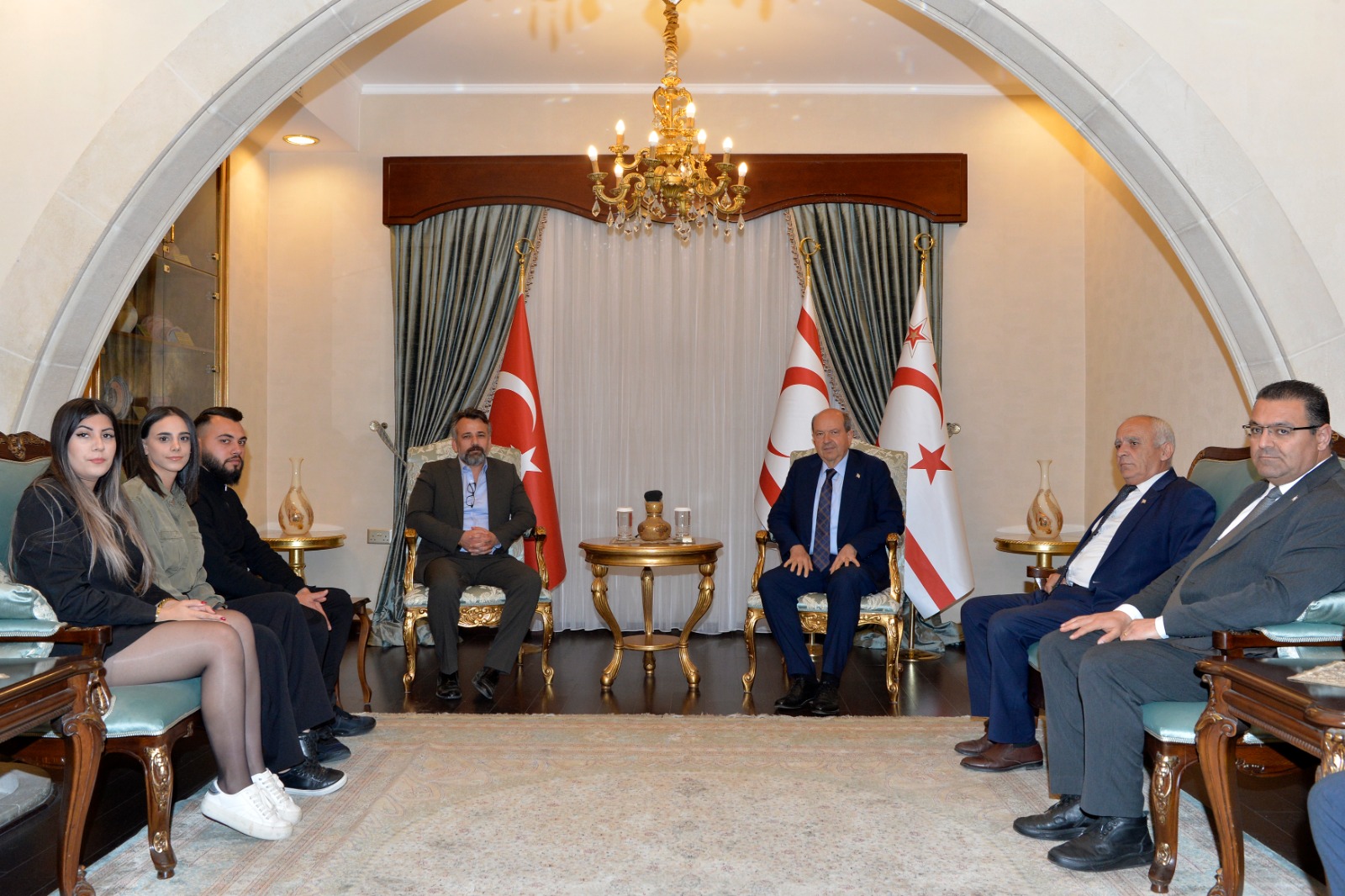 Lefkoşa, 15 Mart 24 (TAK): Cumhurbaşkanı Ersin Tatar, Lefke Avrupa Üniversitesi (LAÜ) Öğretim Üyesi Dr. Güven Arıklı ve İletişim Fakültesi öğrencilerini kabul etti.