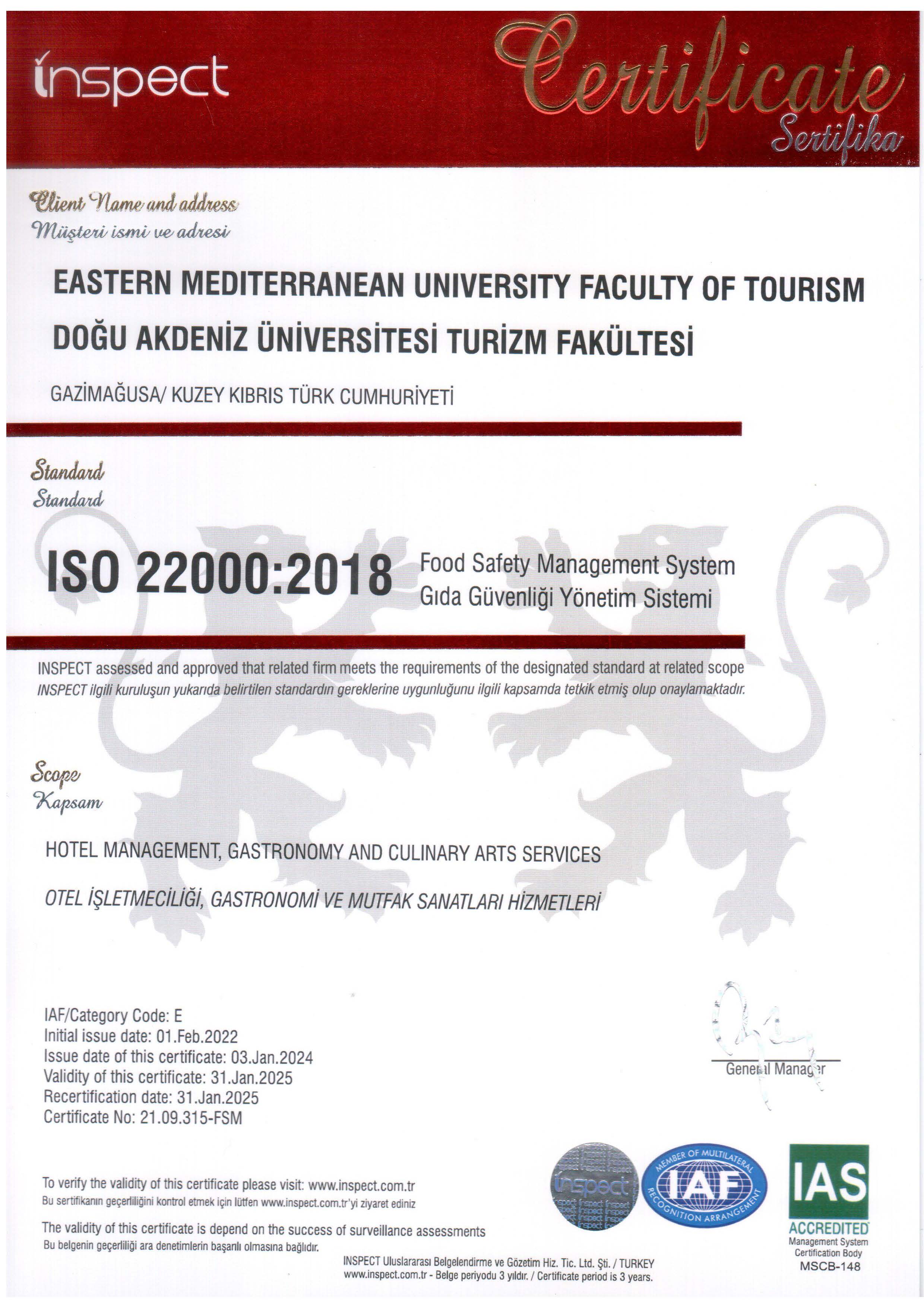 22000:2018 Gıda Güvenliği Yönetim Sistemi standardına akredite olduğu bildirildi.