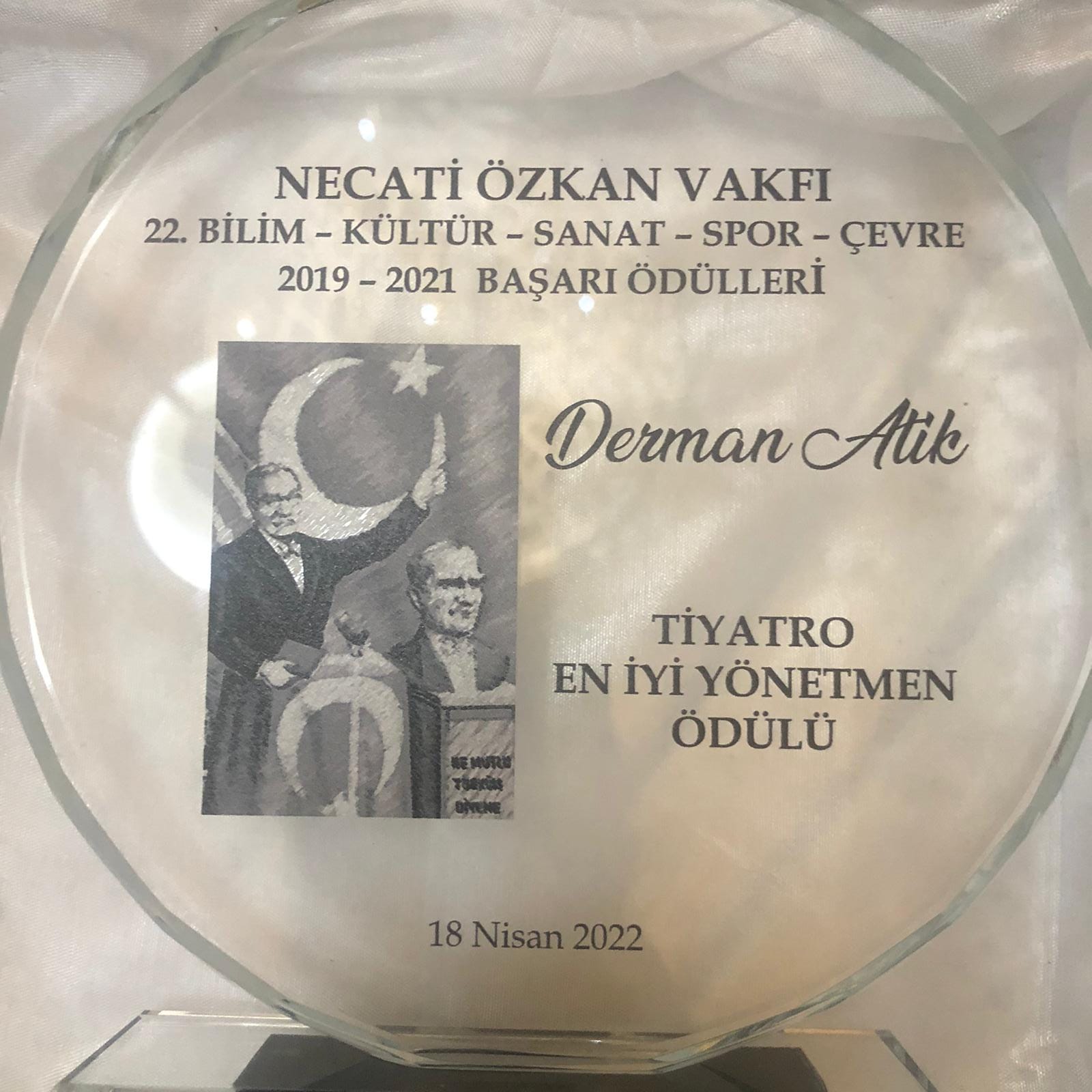 Lefkoşa, 19 Nisan 22 (TAK) Necati Özkan Vakfı Geleneksel Bilim, Kültür, Sanat, Spor ve Çevre Ödülleri kapsamında, Girne Belediyesi ve Çatalköy Belediyesi Sanat Yönetmeni Derman Atik, 2019- 2021 döneminde tiyatro dalında yaptığı çalışmaları nedeniyle ”En İyi Yönetmen” ödülüne layık görüldü.