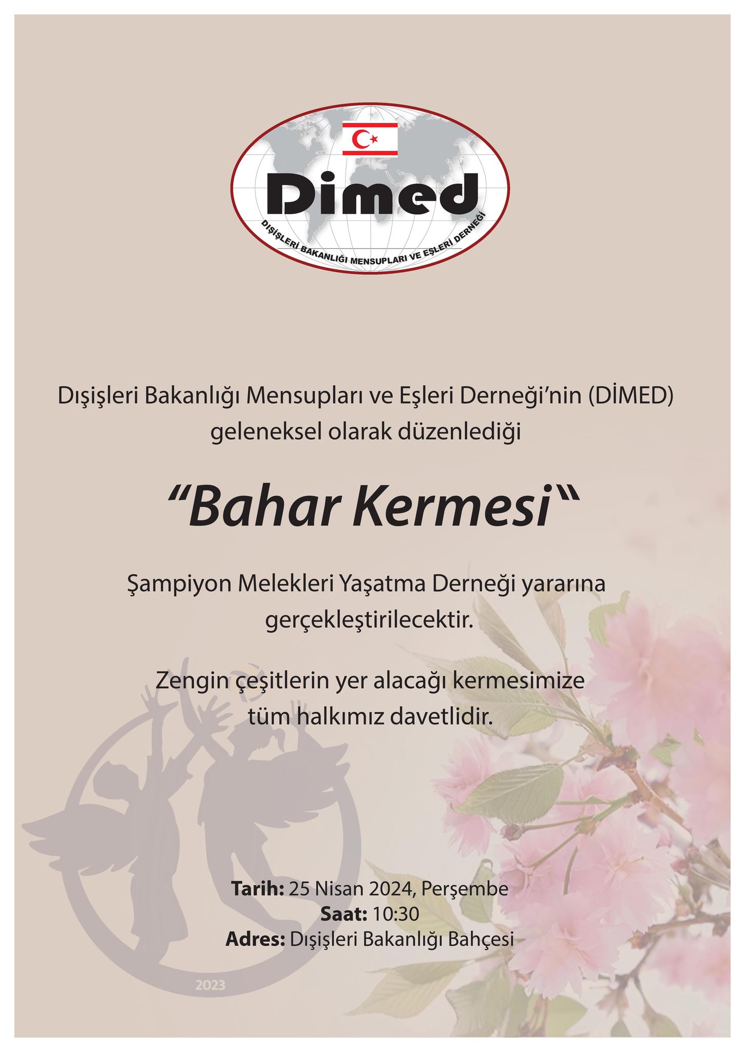 Lefkoşa, 17 Nisan 24 (TAK): Dışişleri Bakanlığı Mensupları ve Eşleri Derneği’nin (DİMED) her yıl geleneksel olarak düzenlediği “Bahar Kermesi” 25 Nisan’da yapılacak.