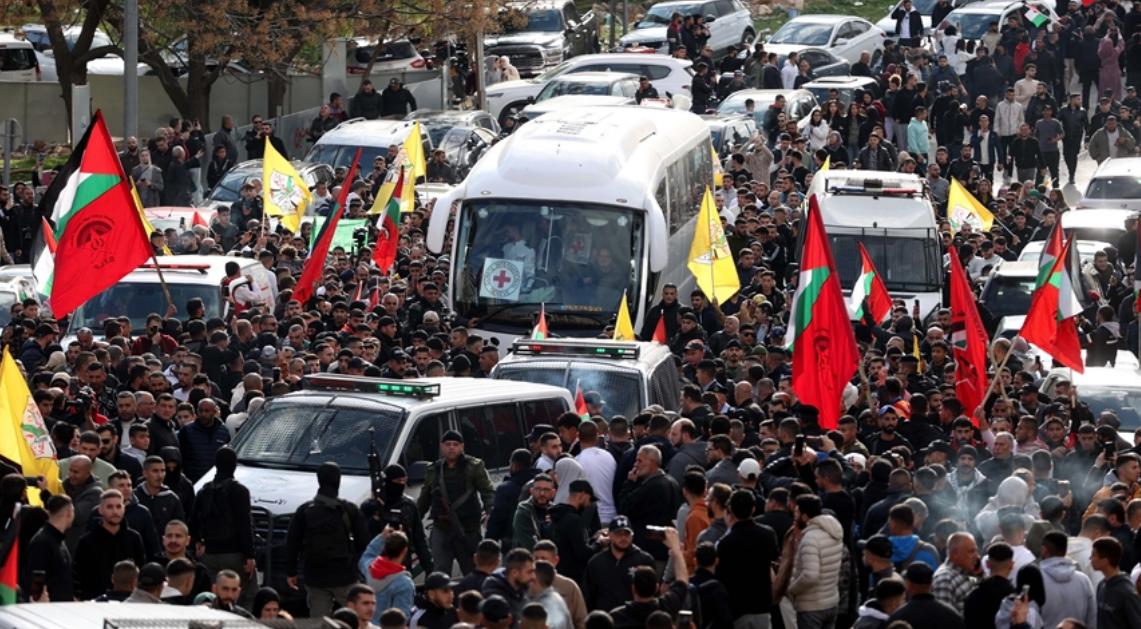 Gazze, 14 Şubat 25 (TAK): Gazze Şeridi'nde yüzlerce Filistinli, ABD Başkanı Donald Trump'ın Gazze planını protesto etti.
