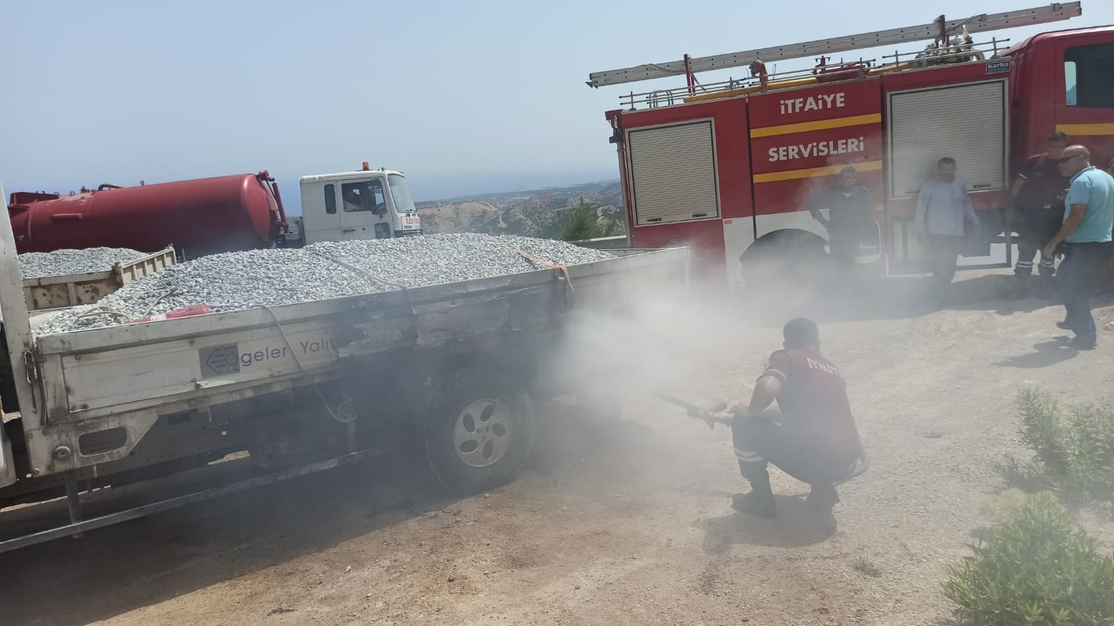 Lefkoşa, 11 Haziran 22 (TAK): Girne - Değirmenlik ana yolunda seyreden çakıl yüklü kamyonet alev aldı. Yangın, egzozun araçtaki ahşap zemine temasından çıktı.