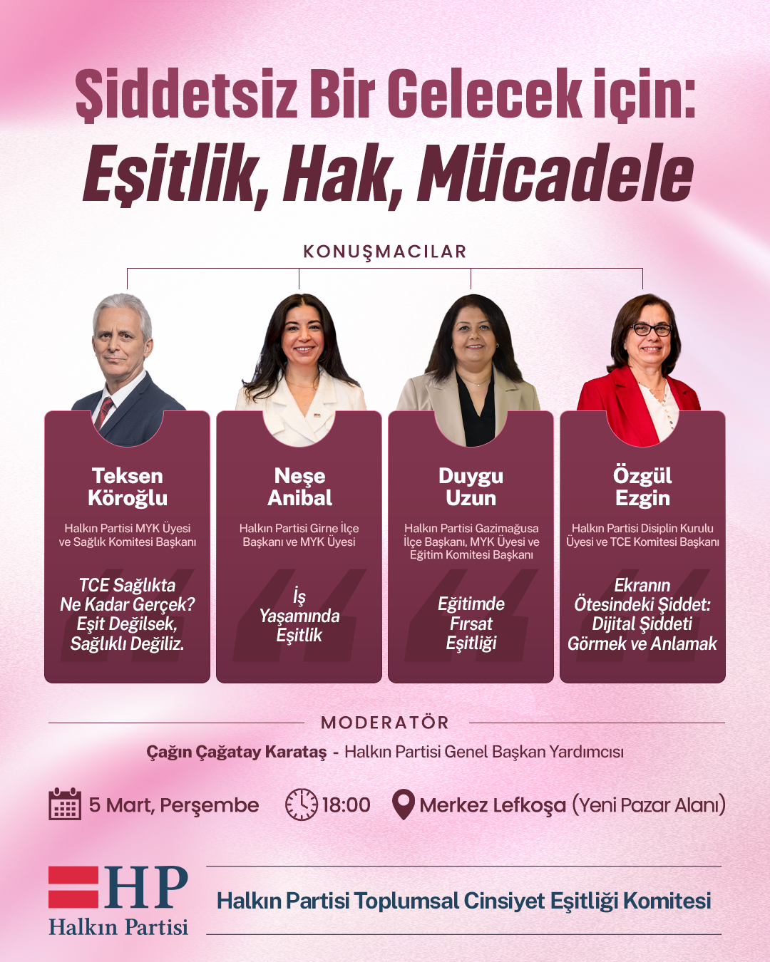 Lefkoşa, 2 Mart 26 (TAK): Halkın Partisi (HP) 8 Mart Dünya Emekçi Kadınlar Günü için “Şiddetsiz Bir Gelecek İçin: Eşitlik, Hak, Mücadele” paneli düzenliyor.